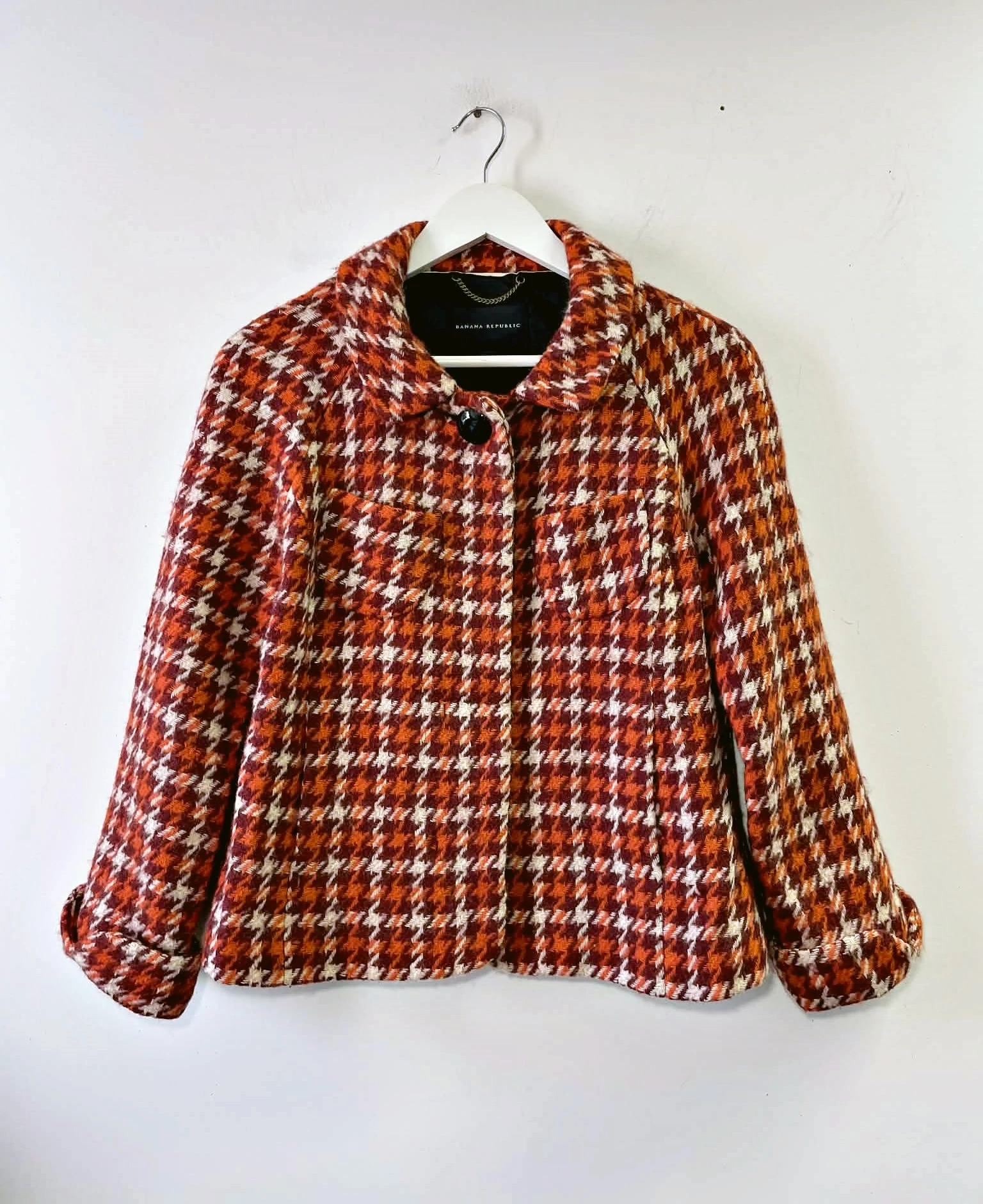 | Narancs-törtfehér-barna kockás gyapjú kabátka, pöttyös béléssel, rejtett gombolással. Két rátett mellzseb, prémium kidolgozás, csinos, nőies fazon. 100% gyapjú. Csodás darab. S-es | |