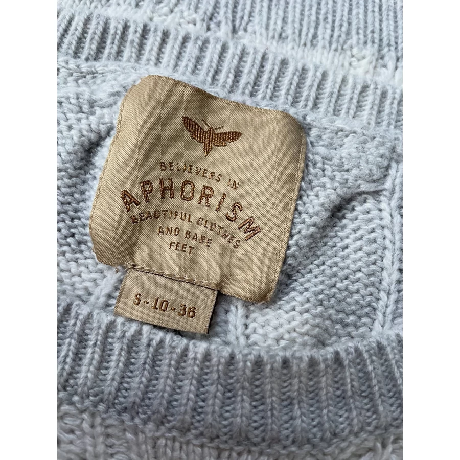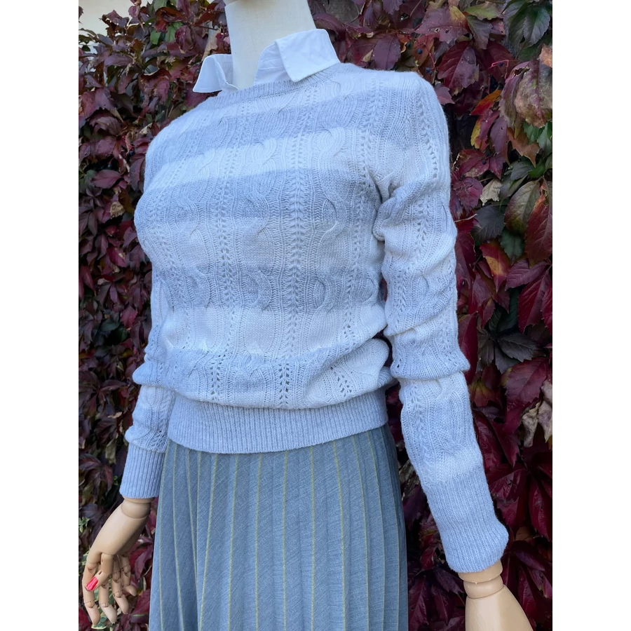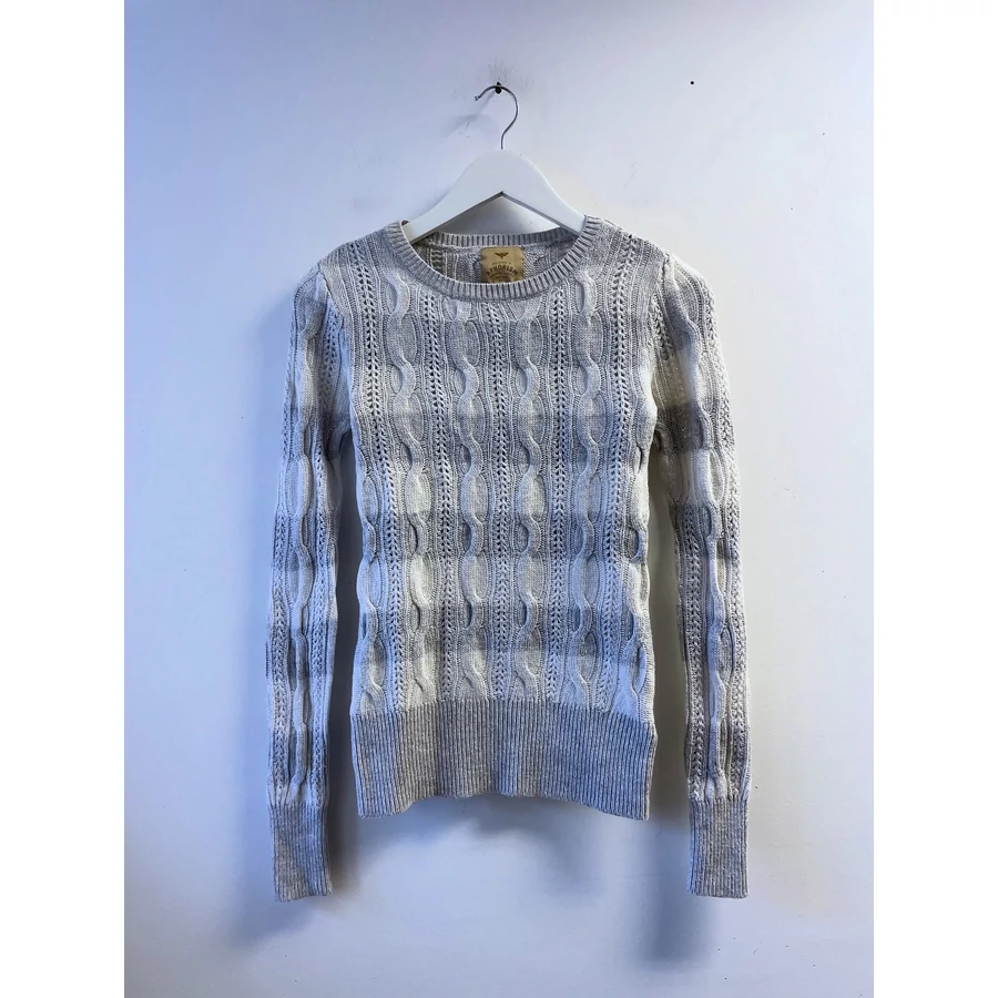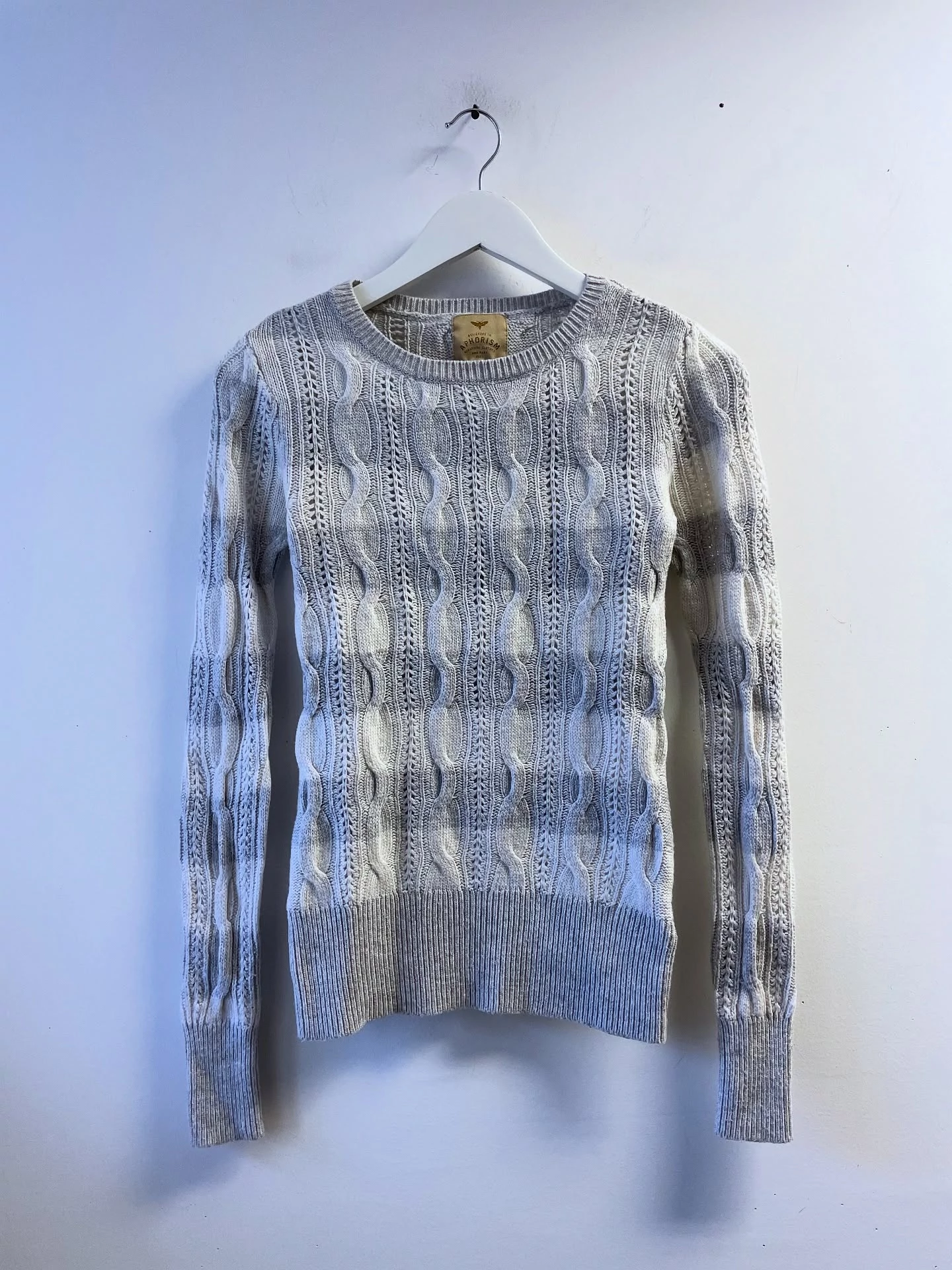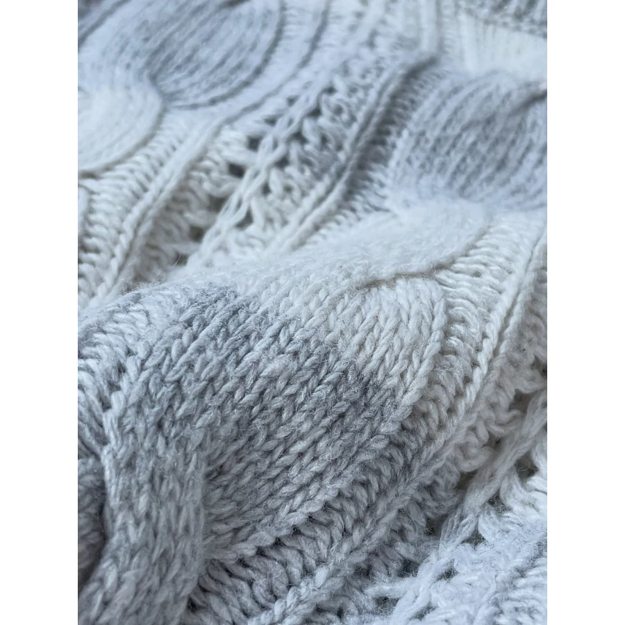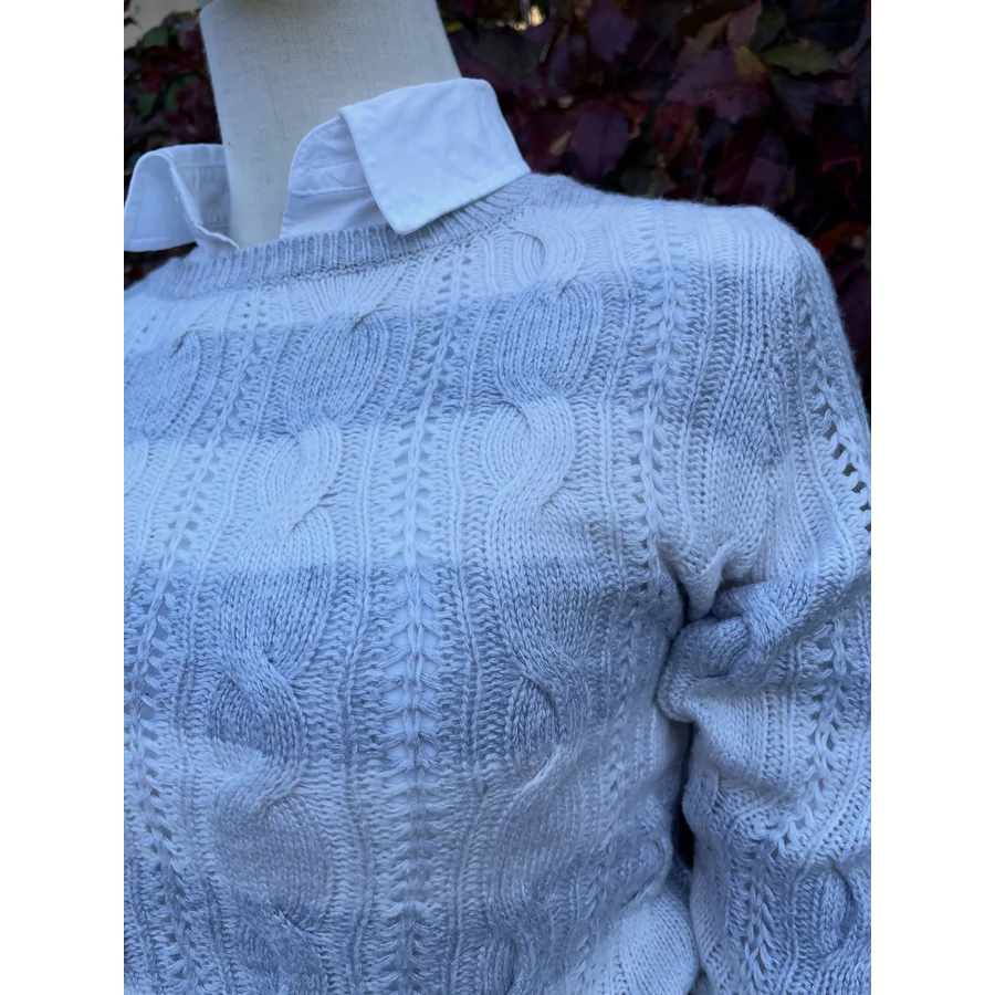 Szürke-törtfehér csíkos, csavart mintás merinó gyapjú keverék pulóver. S-es