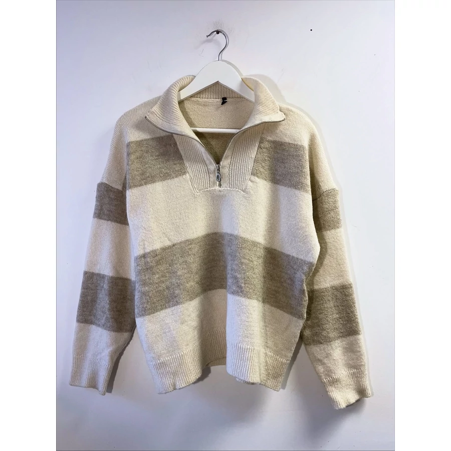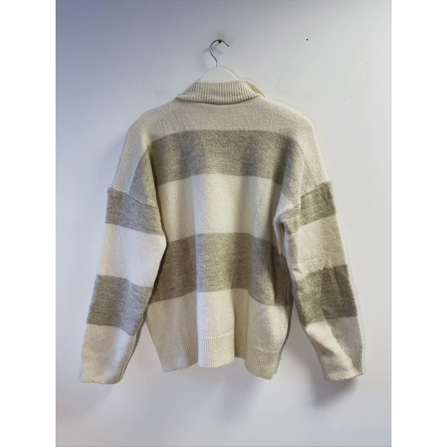 | Bézs-világosbézs csíkos, galléros kötött pulóver. Bizományba érkezett, az anyagösszetételét nem tudjuk, mert tulajdonosa kivágta a címkét. Finom, puha, nem szúrós anyag, gyapjú nincsen benne szerintem. L-es, de oversize viseletben M-re is ajánlom. | |