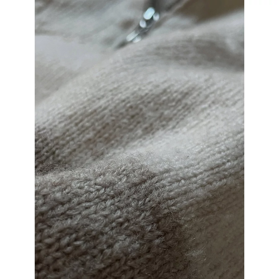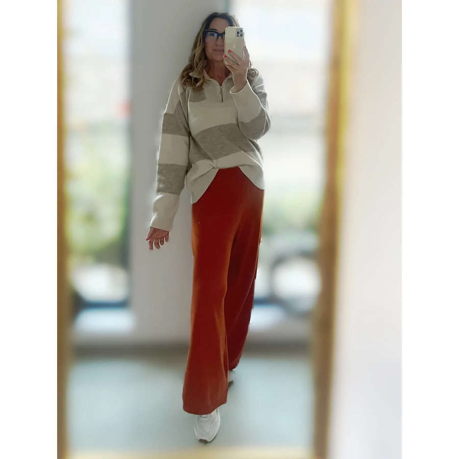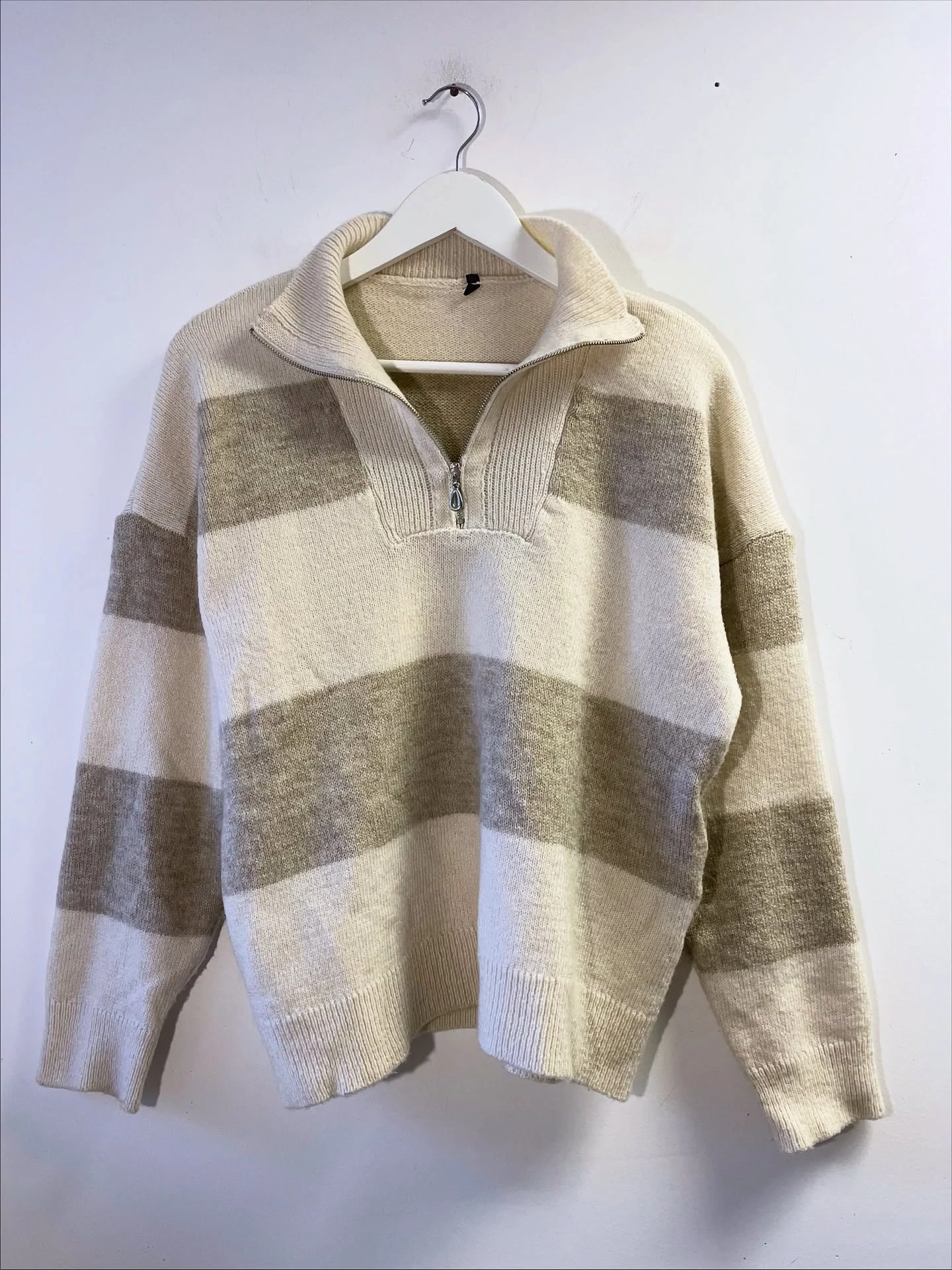 Bézs-világosbézs csíkos, galléros kötött pulóver. Bizományba érkezett, az anyagösszetételét nem tudjuk, mert tulajdonosa kivágta a címkét. Finom, puha, nem szúrós anyag, gyapjú nincsen benne szerintem. L-es, de oversize viseletben M-re is ajánlom.
