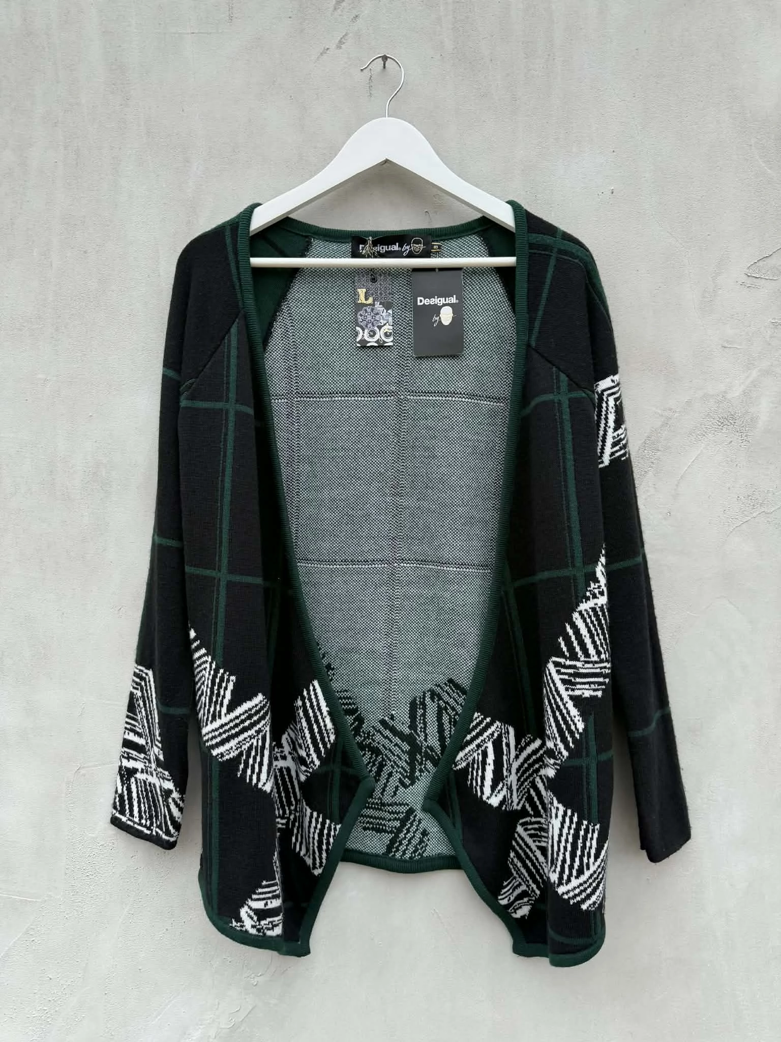 | Gyapjú keverék, vékonykötött zöld-fekete mintás Desigual collab Lacroix kardigán. Új, címkés. S-es, de szabása miatt kisebb M-re is javaslom. (eredeti ára 90 Eur) | |