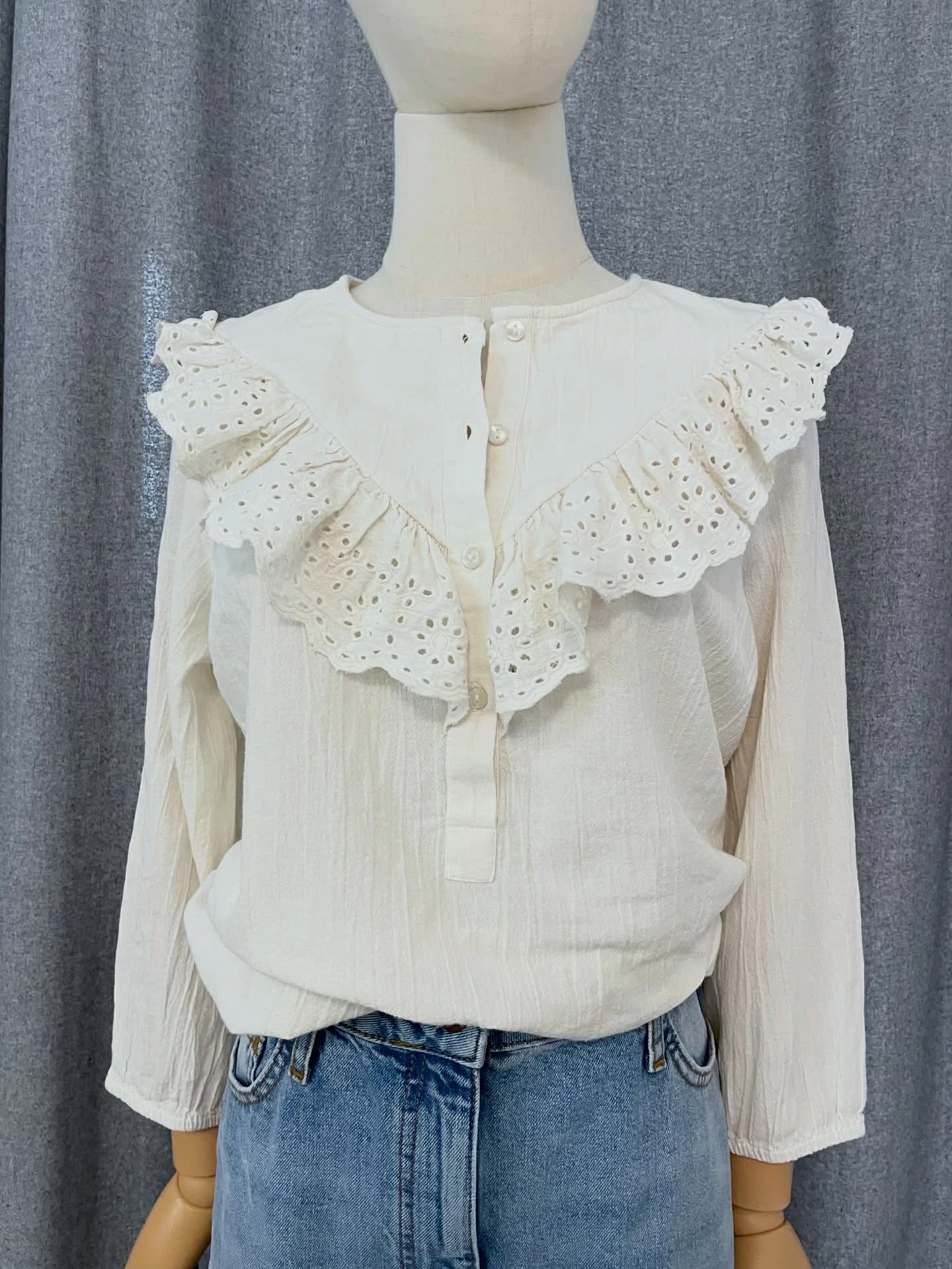 Háromnegyedes ujjú, ekrü blúz, csipkés fodorral díszítve. Végig gombos, anyagcímkét nem találtam benne, pamut-len keverék anyagnak gondolom. Kellemes, jó tartasú anyag. M-es, de S-re is ajánlom.