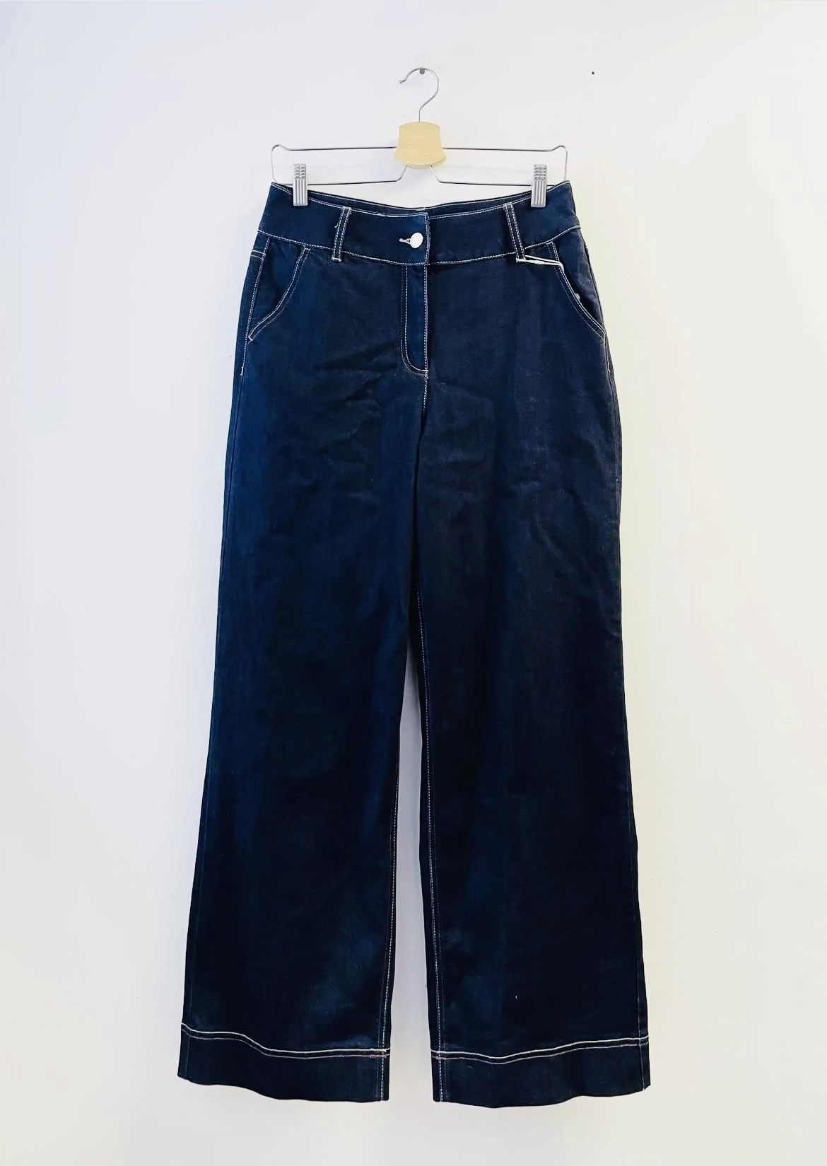 Sötétkék, bőszárú farmernadrág széles felhajtóval. Beleírt 29/30 de inkább 30/30. Rugalmas. Új, címkés