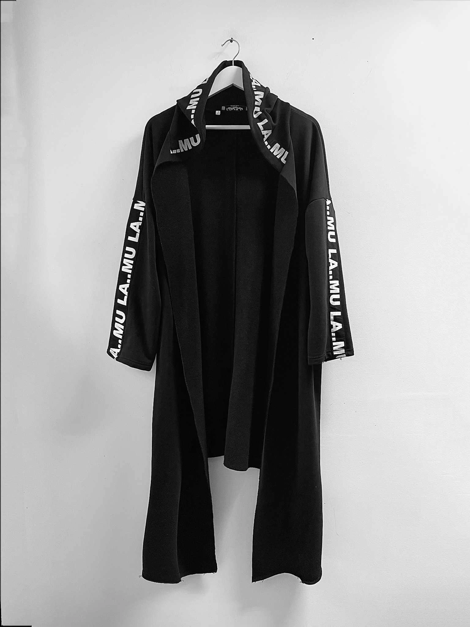 Fekete, pamut keverék aszimmetrikus, kapucnis felső. Hátán, ujján, kapucniján fehér felirat. 3-as, L-es méret, de oversize viseltben M-re is ajánlom.