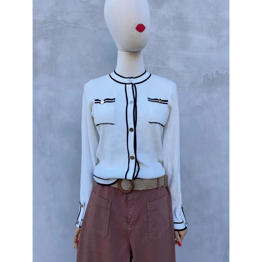 | Fekete-fehér finomkötött kardigán, rátett zsebekkel. Bizományba érkezett, minden címkét kivágtak belőle, így csak tippelni tudom az anyagösszetételt, pamut-viszkóz és biztosan van benne pici poliészter is. Kellemes, puha tapintású. Arany színű gombok díszítik. Új, használatlan. S-es | |