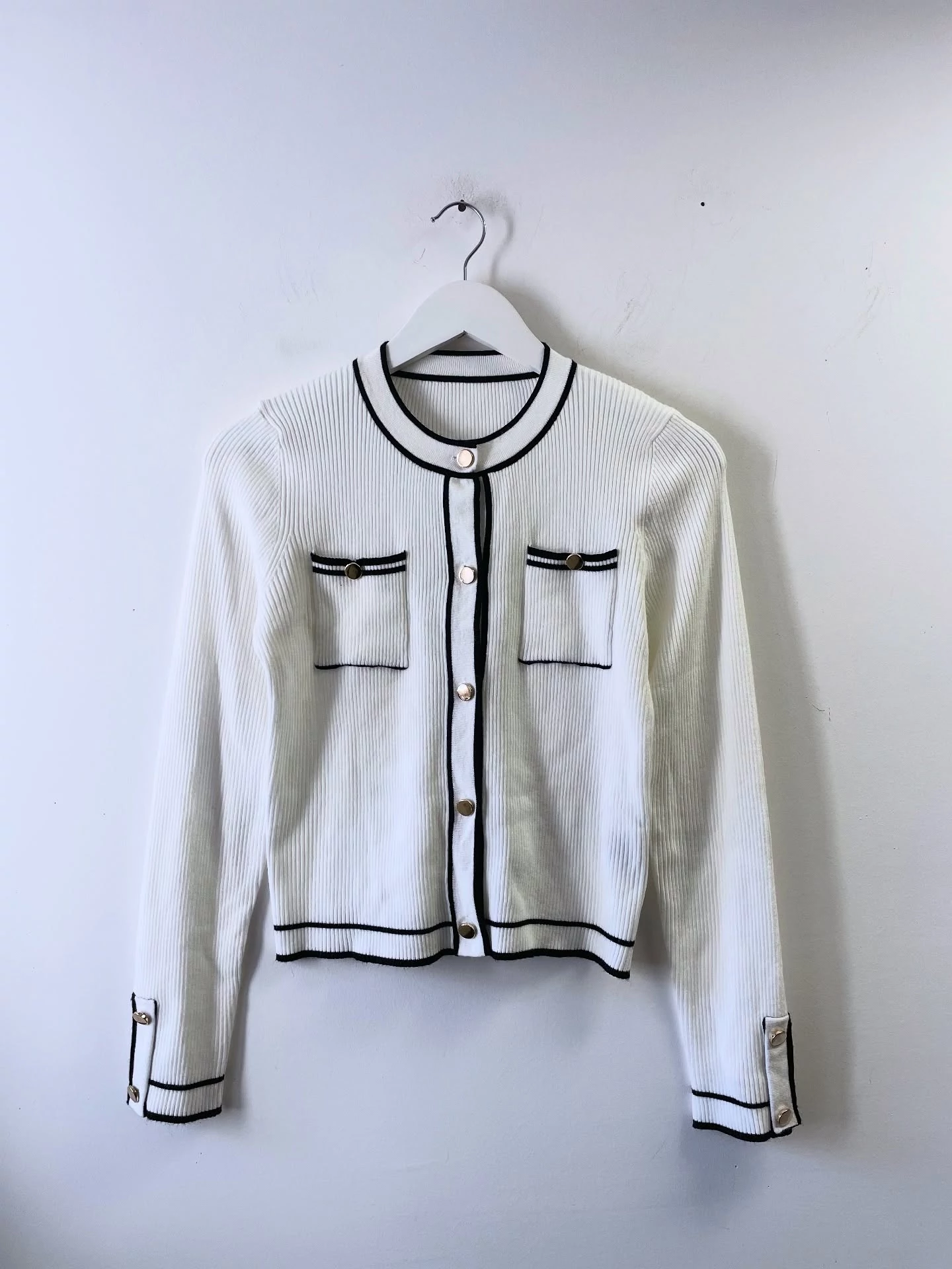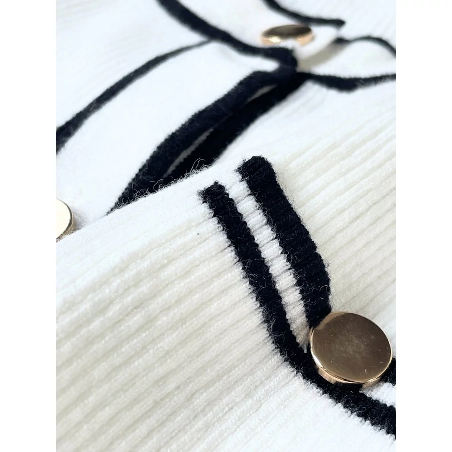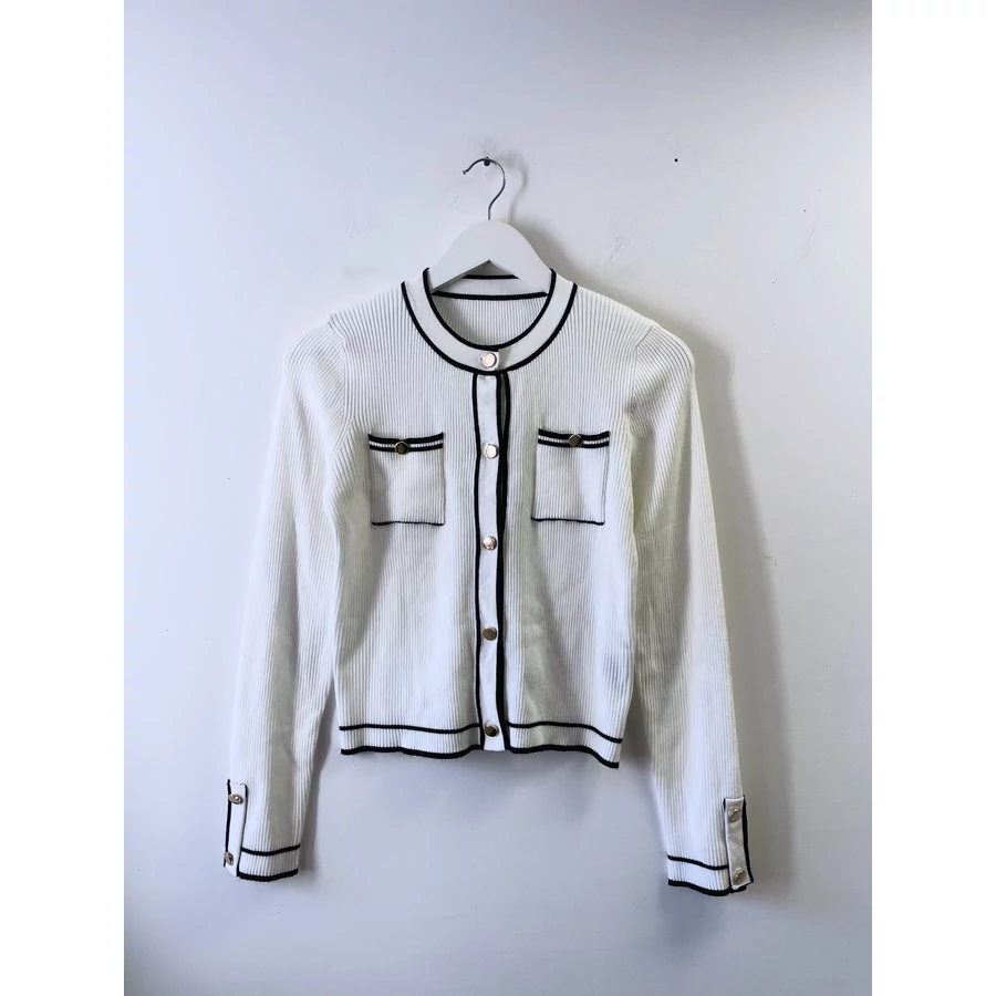Fekete-fehér finomkötött kardigán, rátett zsebekkel. Bizományba érkezett, minden címkét kivágtak belőle, így csak tippelni tudom az anyagösszetételt, pamut-viszkóz és biztosan van benne pici poliészter is. Kellemes, puha tapintású. Arany színű gombok díszítik. Új, használatlan. S-es