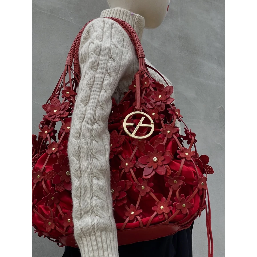 | Piros, fényes és matt bőr virágokból összeállított váll/kézitáska. Pompás darab, egy szatén bélés jár hozzá, amely zsinórral összehúzható, így zárható a táska. Nagy, márkafeliratos arany színű fémlogó díszíti, illetve a virágok fém közepe is több helyen logózott. Ha egy különleges, piros táskára vágytál, akkor megtaláltad! (A brand táskáira saját webshopján ránézve 500 Eur alatt nem találtam táskát.) | |