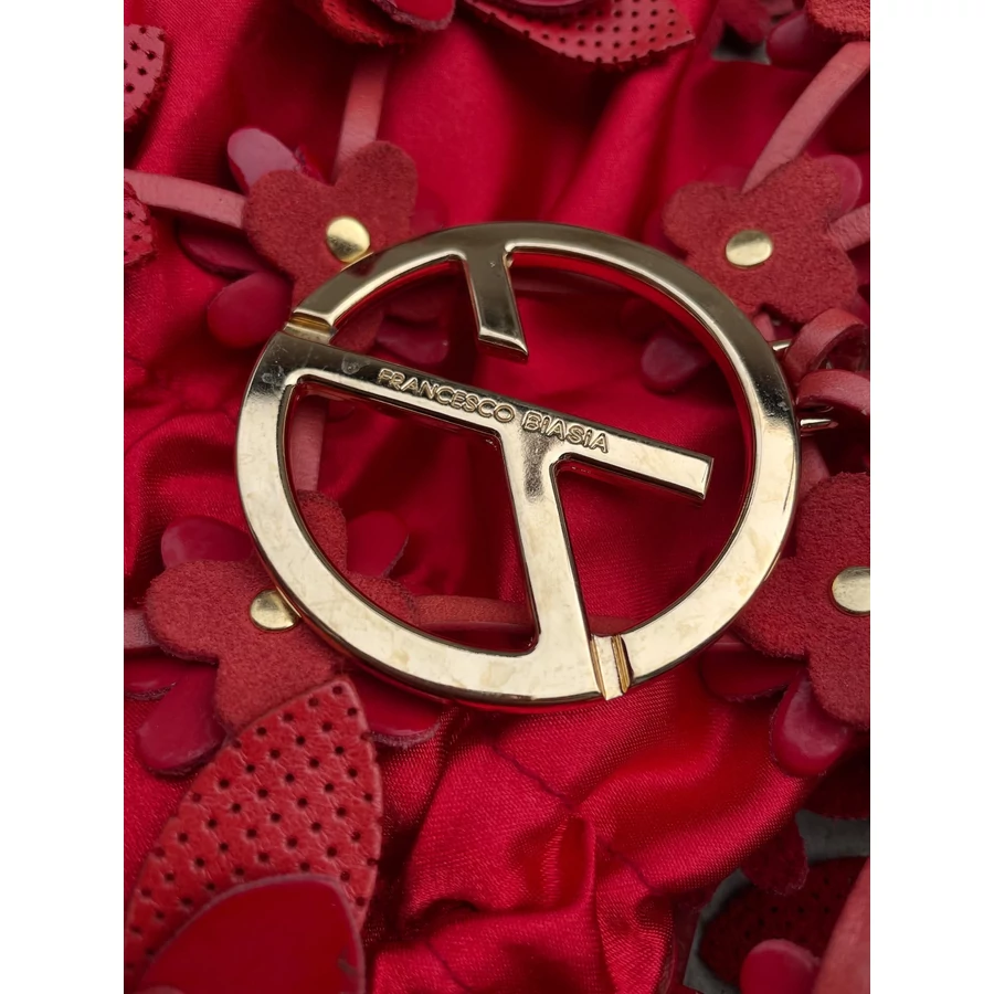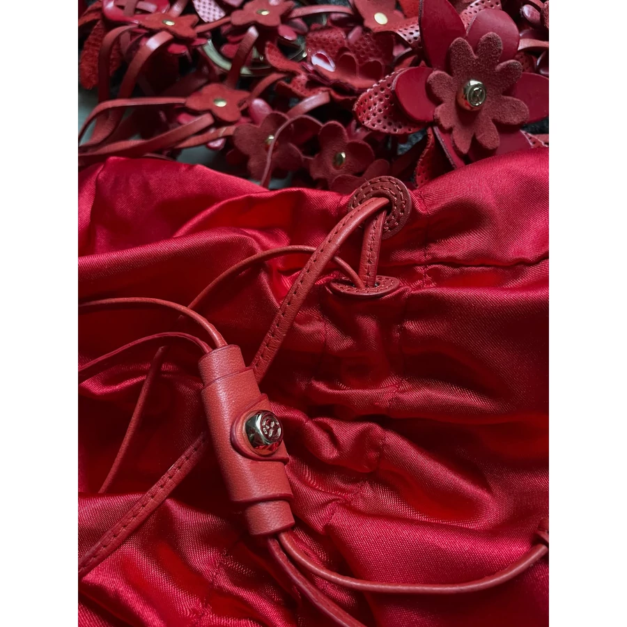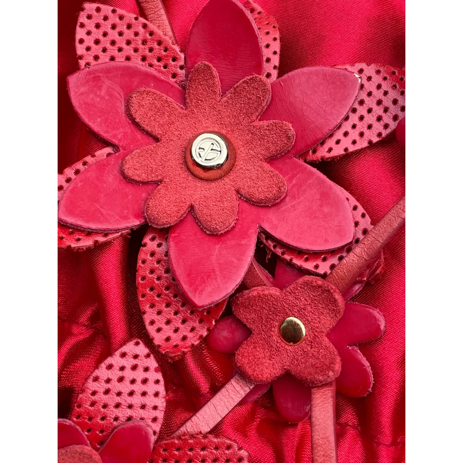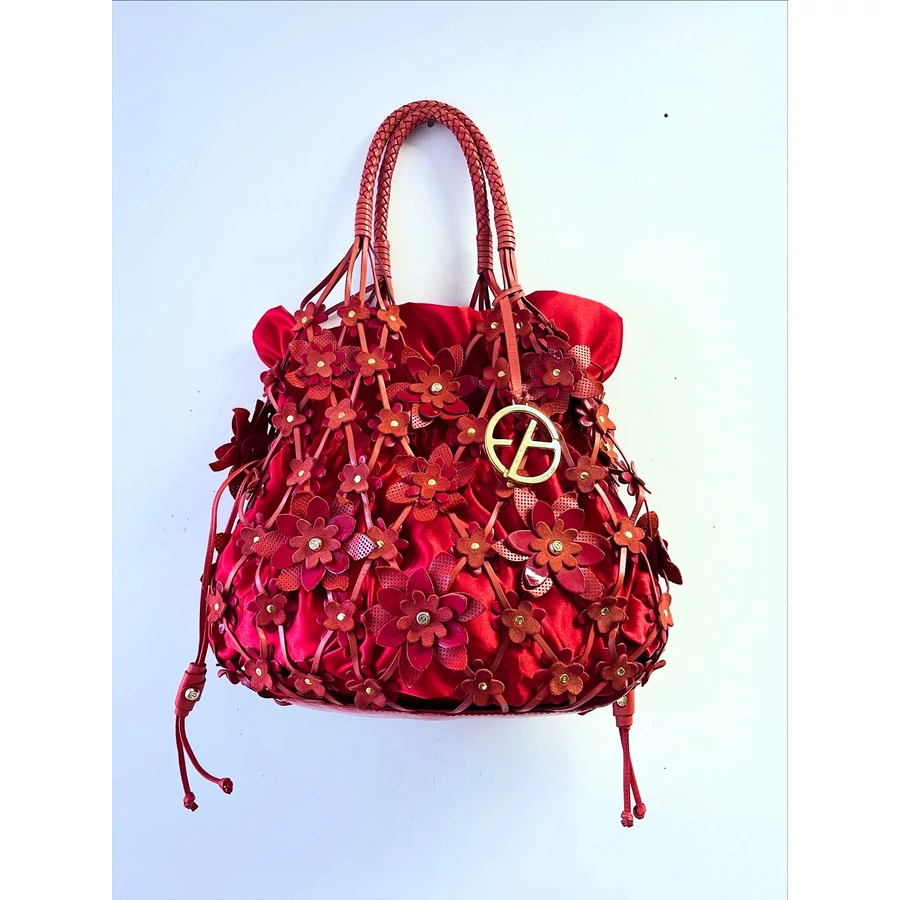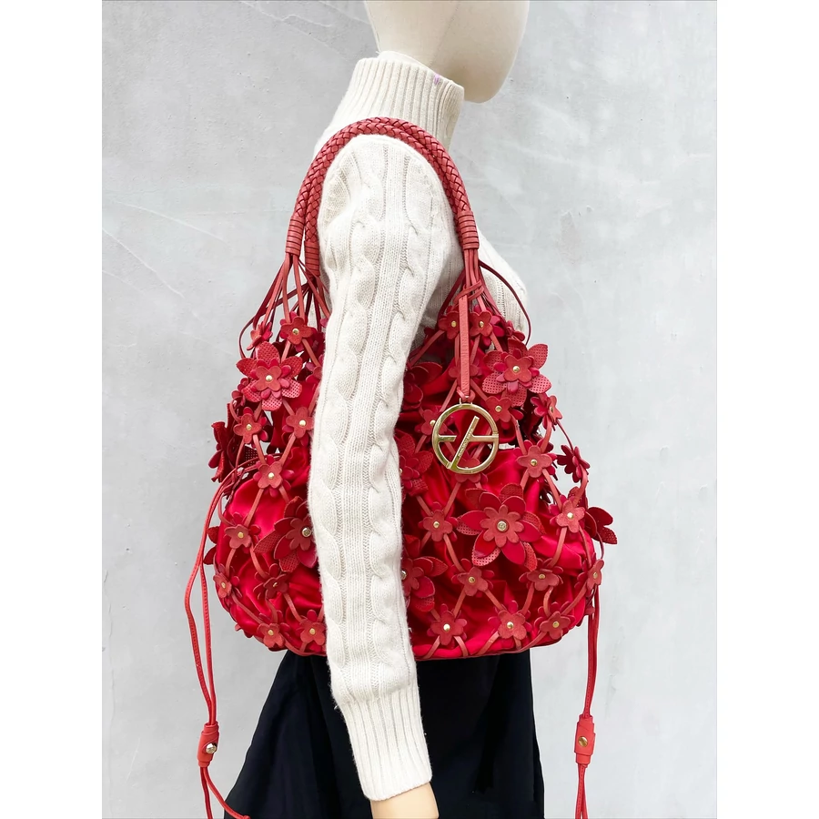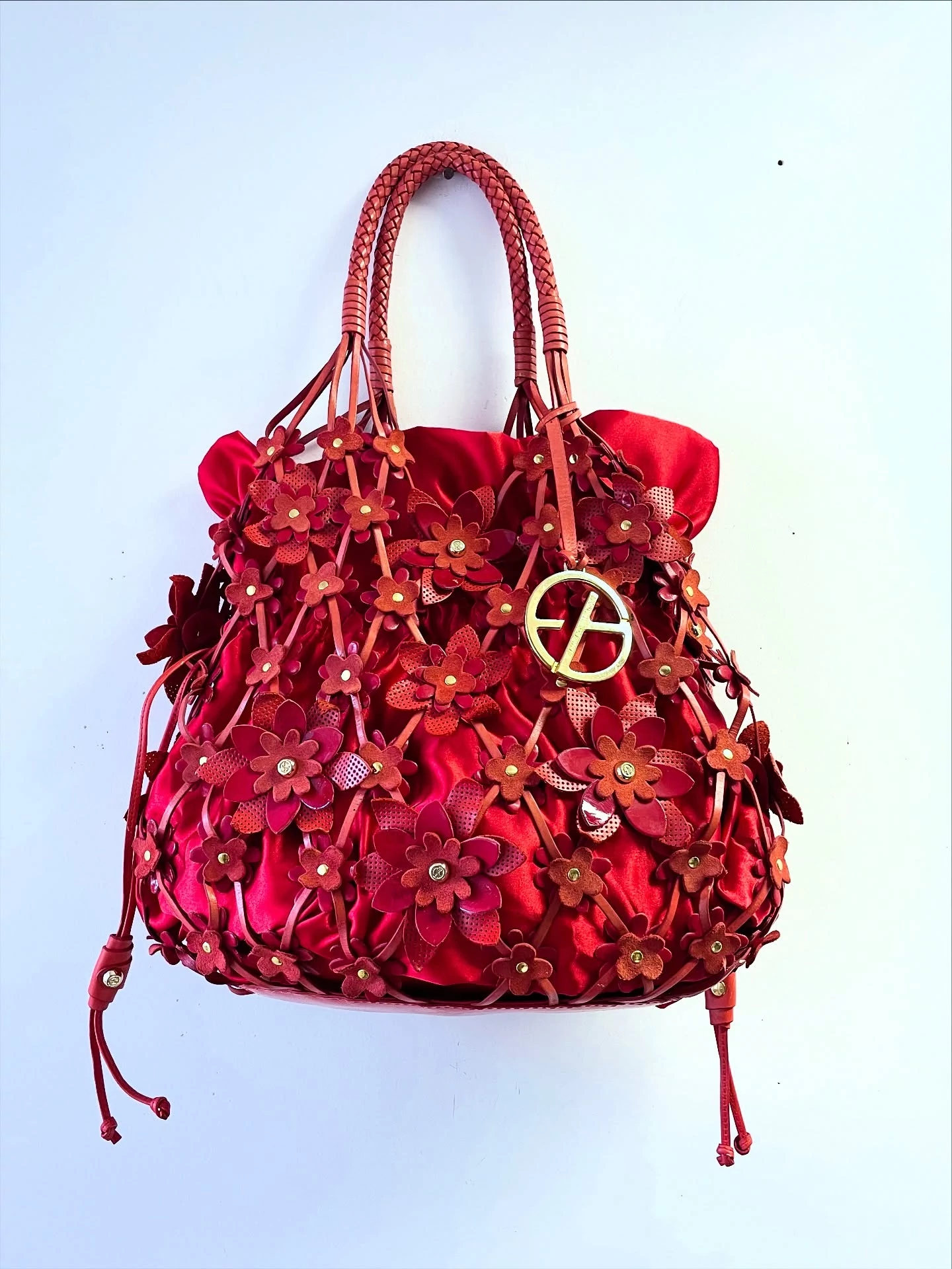 Piros, fényes és matt bőr virágokból összeállított váll/kézitáska. Pompás darab, egy szatén bélés jár hozzá, amely zsinórral összehúzható, így zárható a táska. Nagy, márkafeliratos arany színű fémlogó díszíti, illetve a virágok fém közepe is több helyen logózott. Ha egy különleges, piros táskára vágytál, akkor megtaláltad!