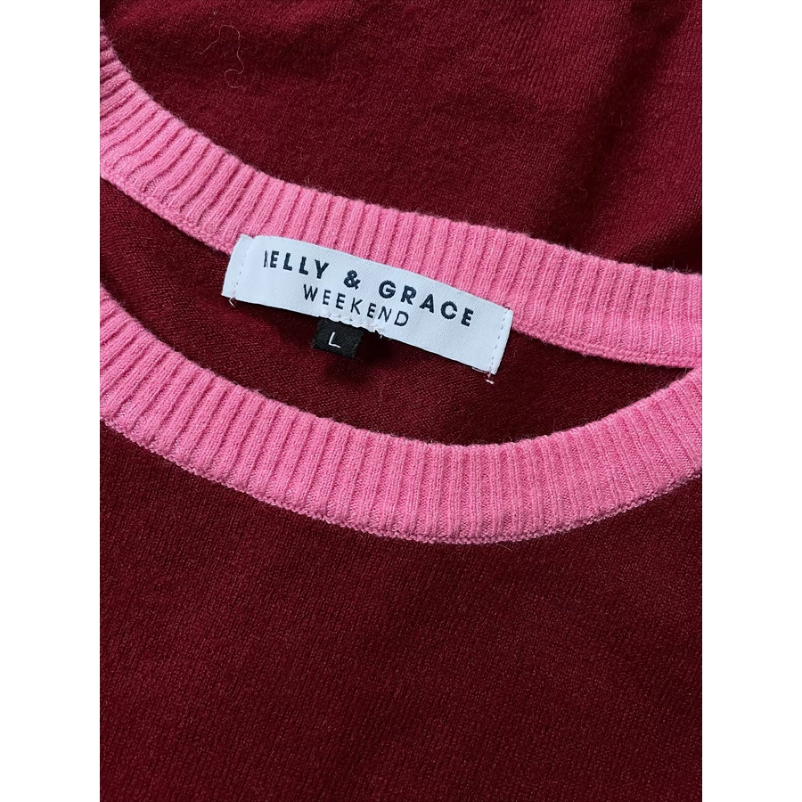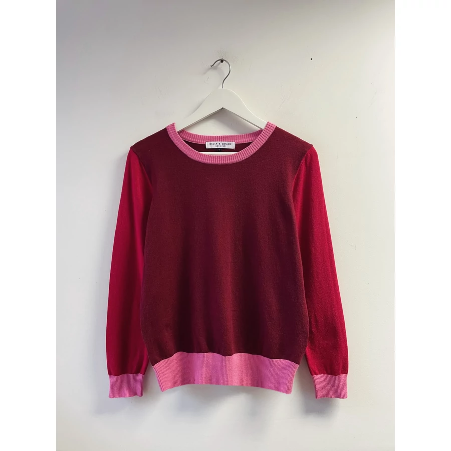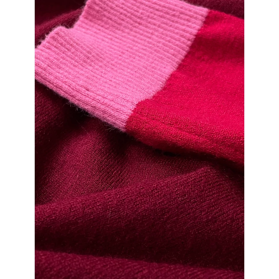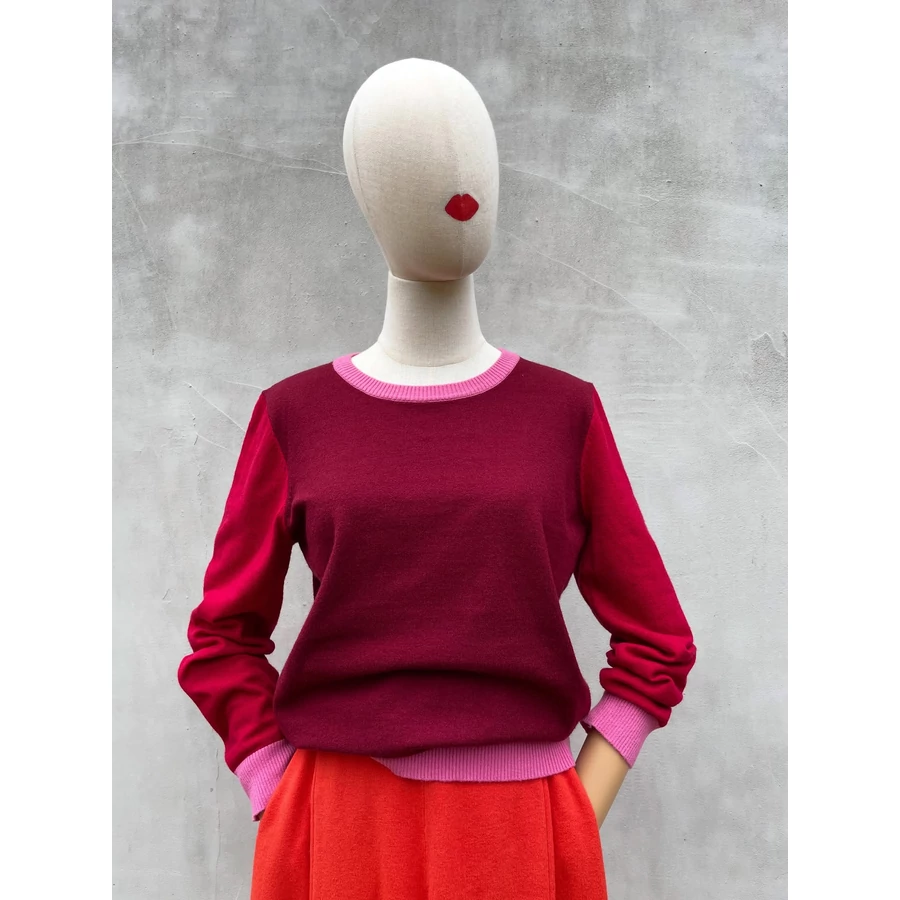 Finomkötött, viszkóz keverék kerek nyakú pulóver, pink, burgundi és meggypiros színekke. Szép, nőies darab az ősz gyönyörű színeivel. L-es