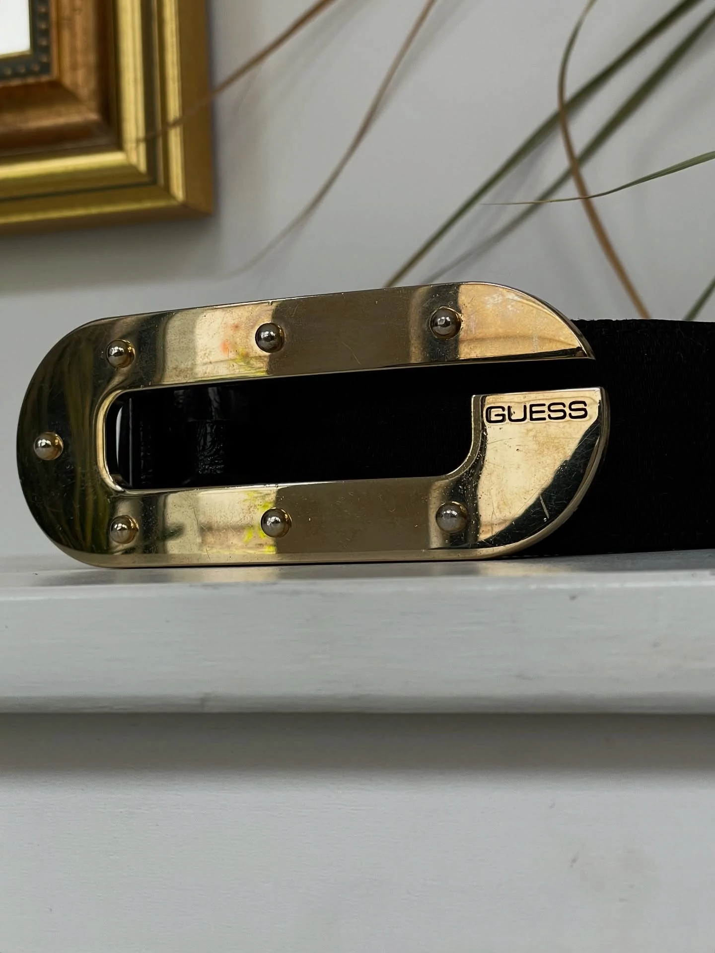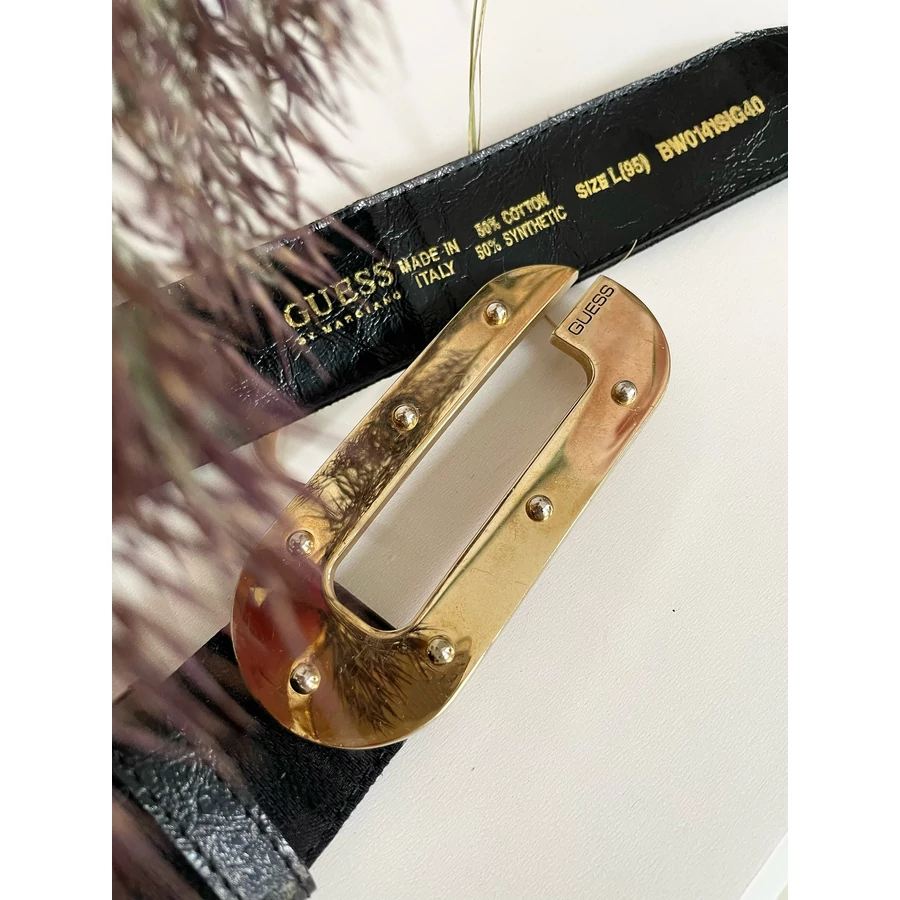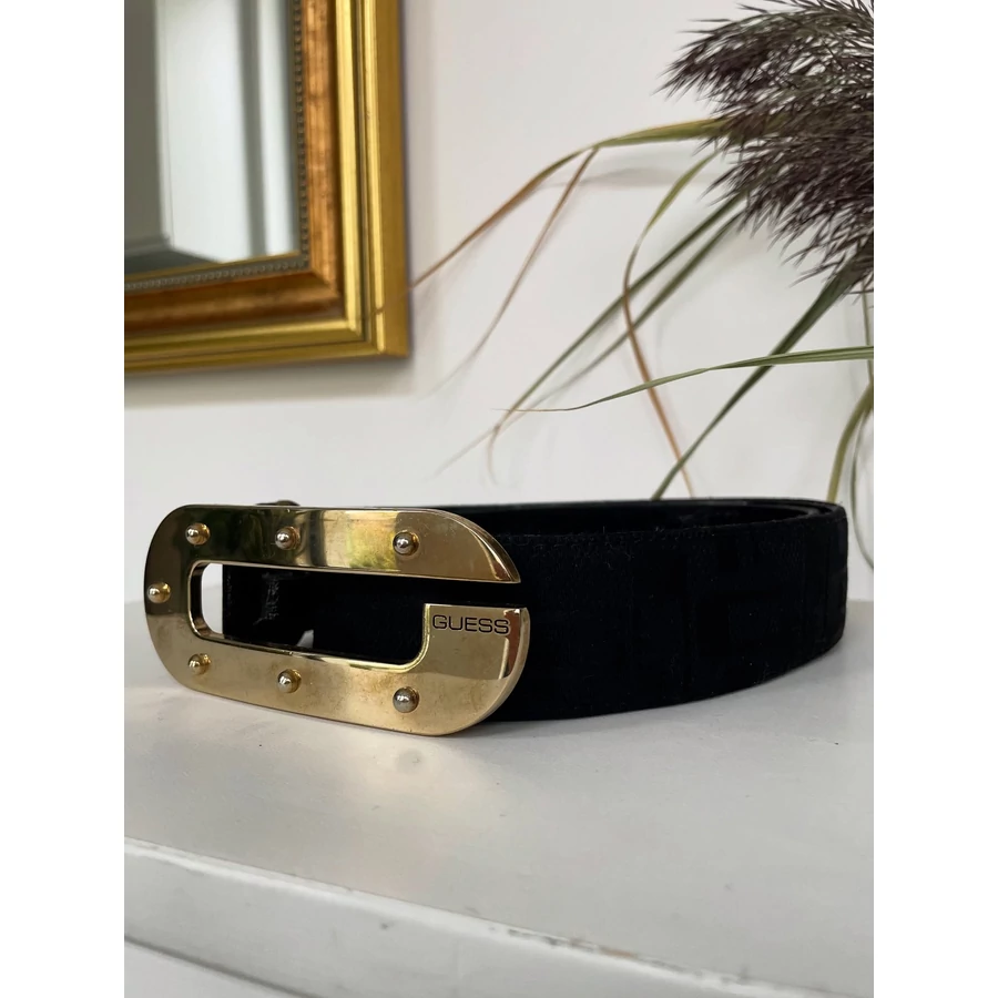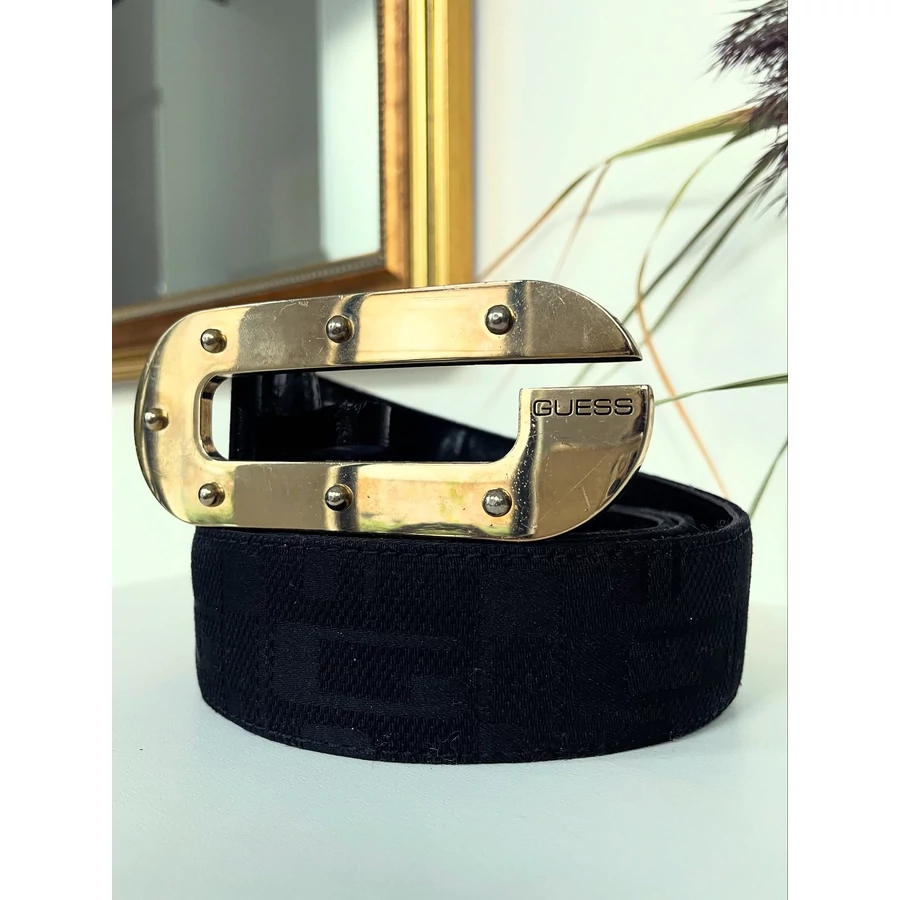 | Fekete, pamut-szintetikus keverék, G betűvel szövött Guess öv. L-es 95 cm. Arany színű csat része kissé karcos. | |