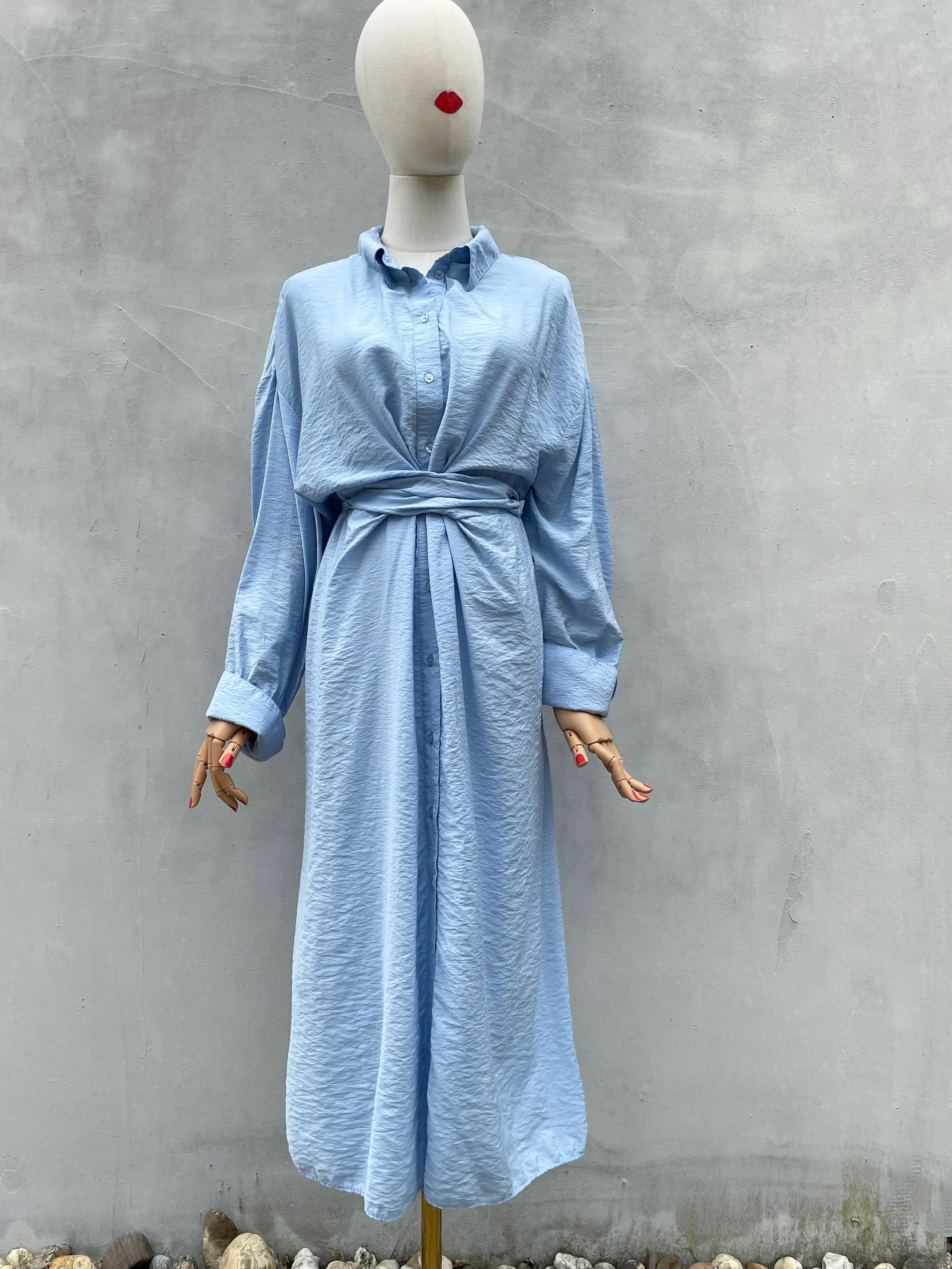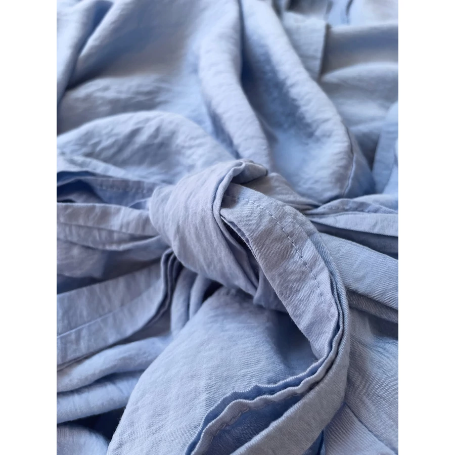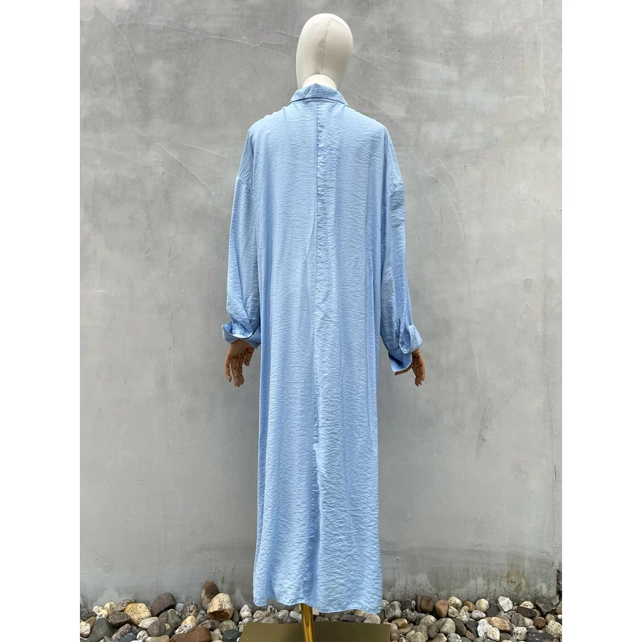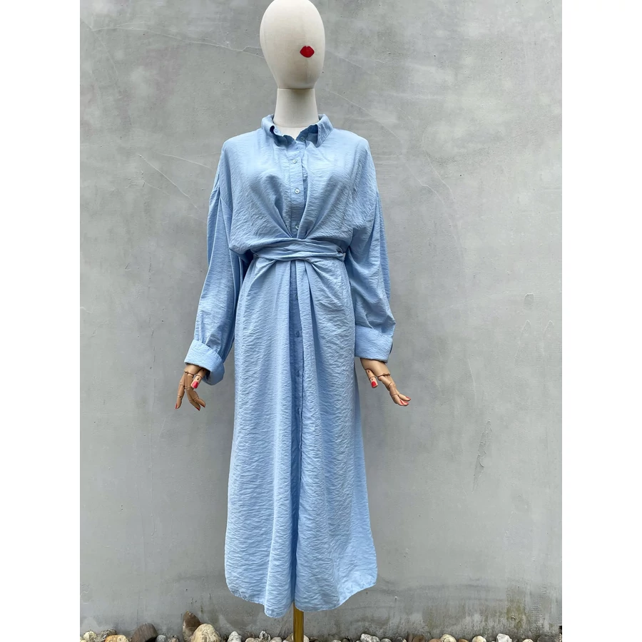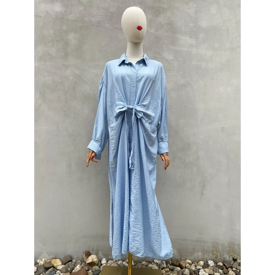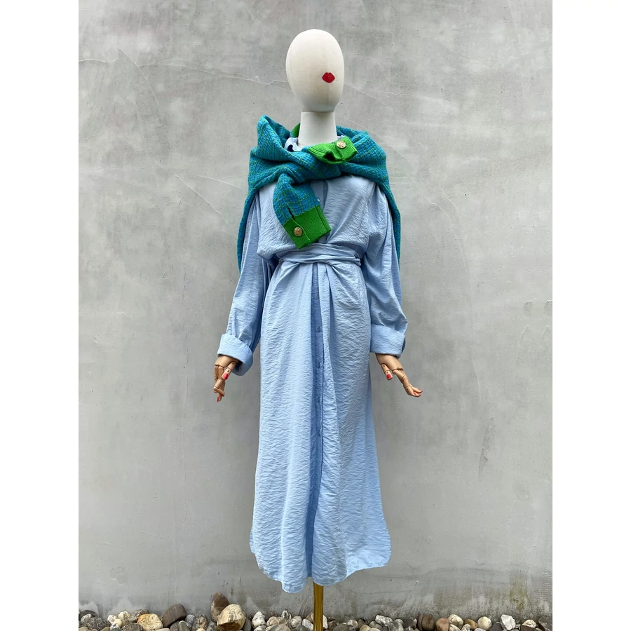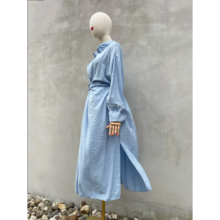Világoskék, viszkóz midiruha. Nagyon szép színe és kellemes anyaga is van. L-es