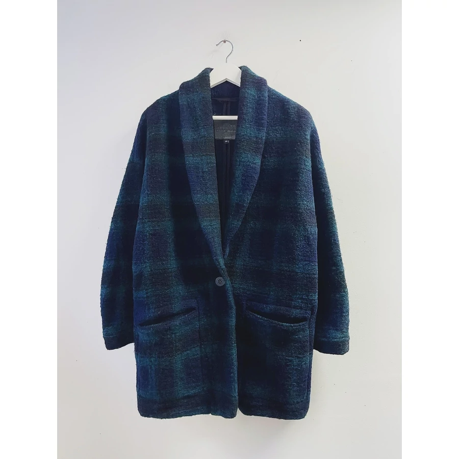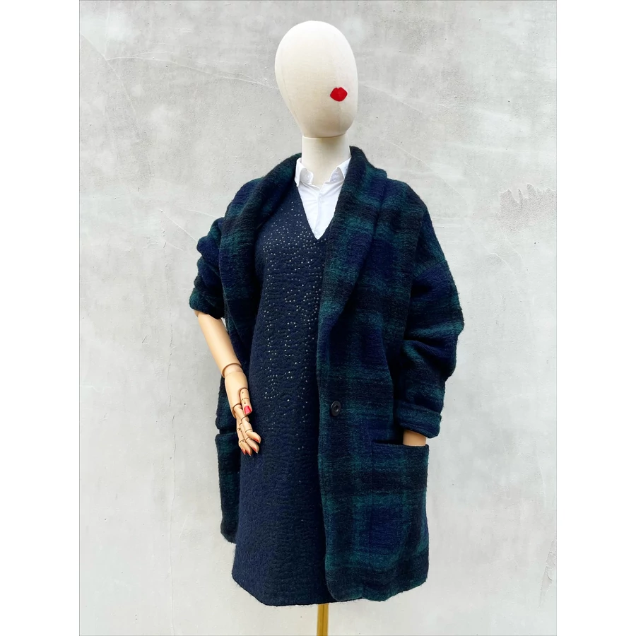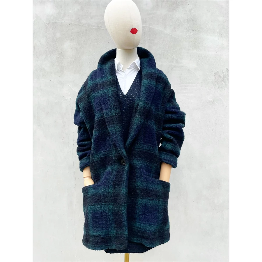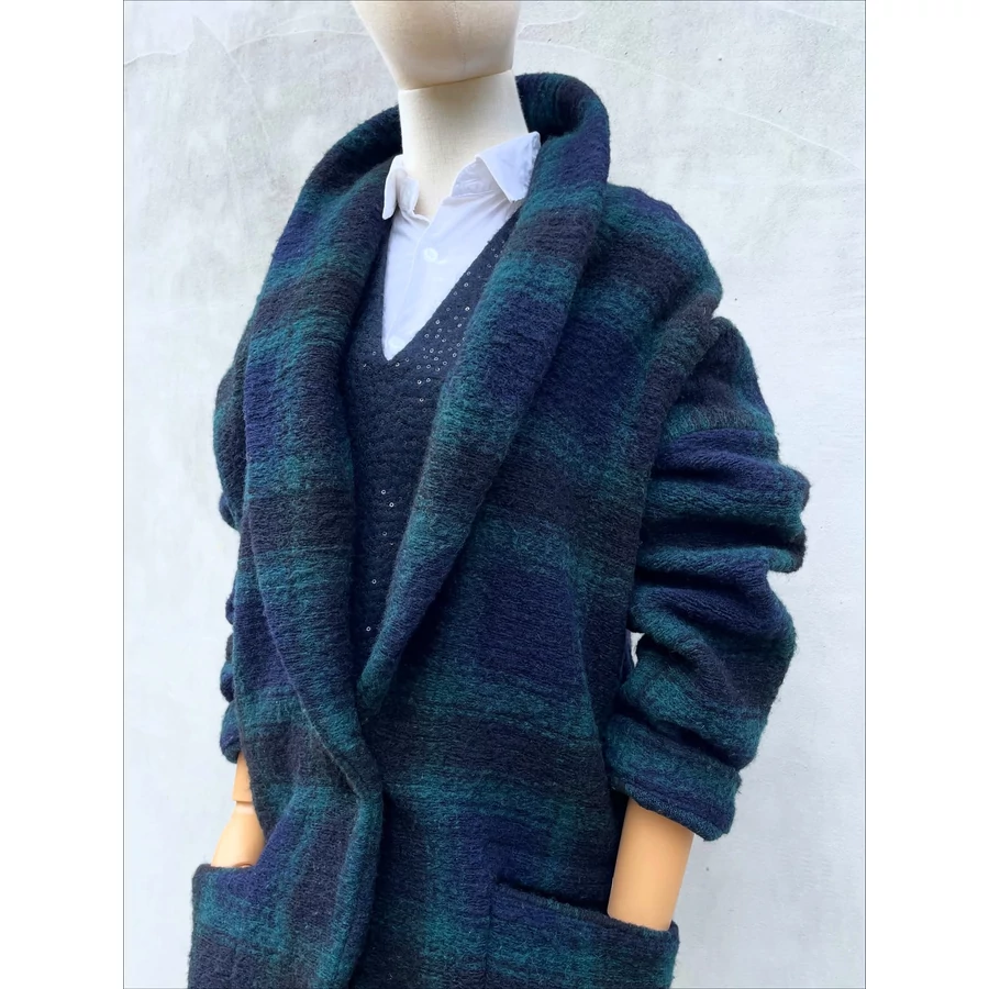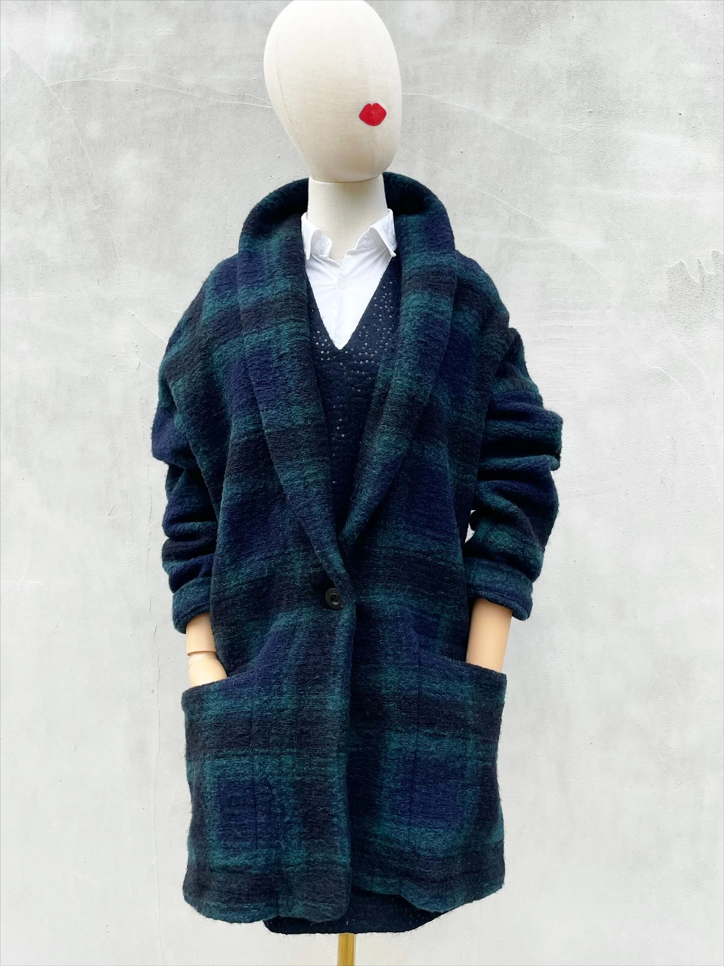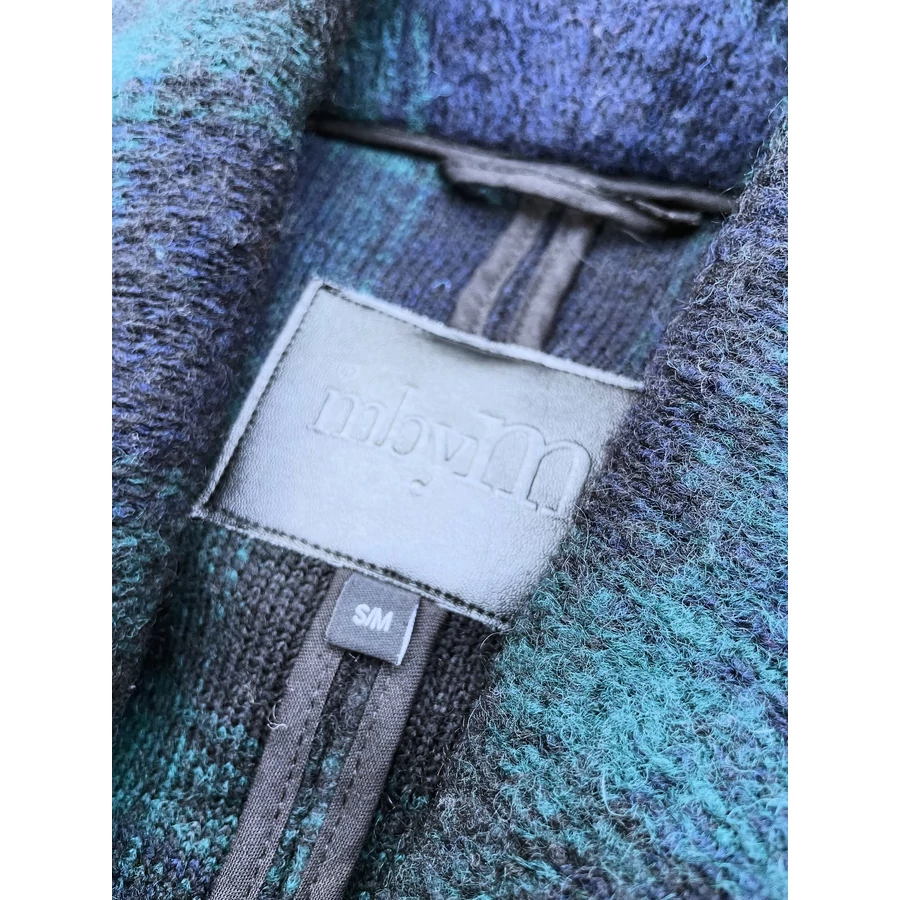 mbyM sötétkék-zöld kockás, sálgalléros kockás kabát. Gyapjú keverék. S/M méretre