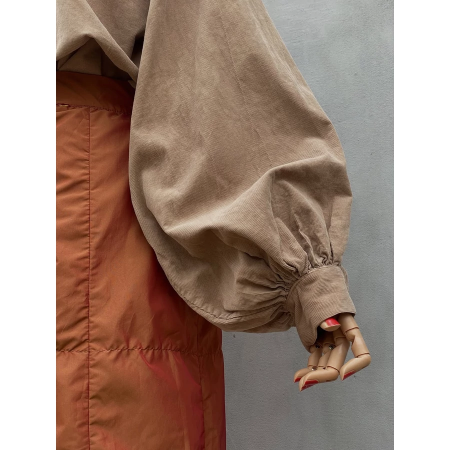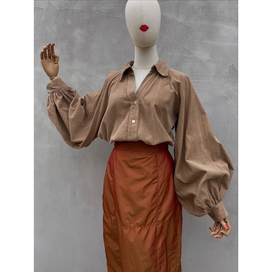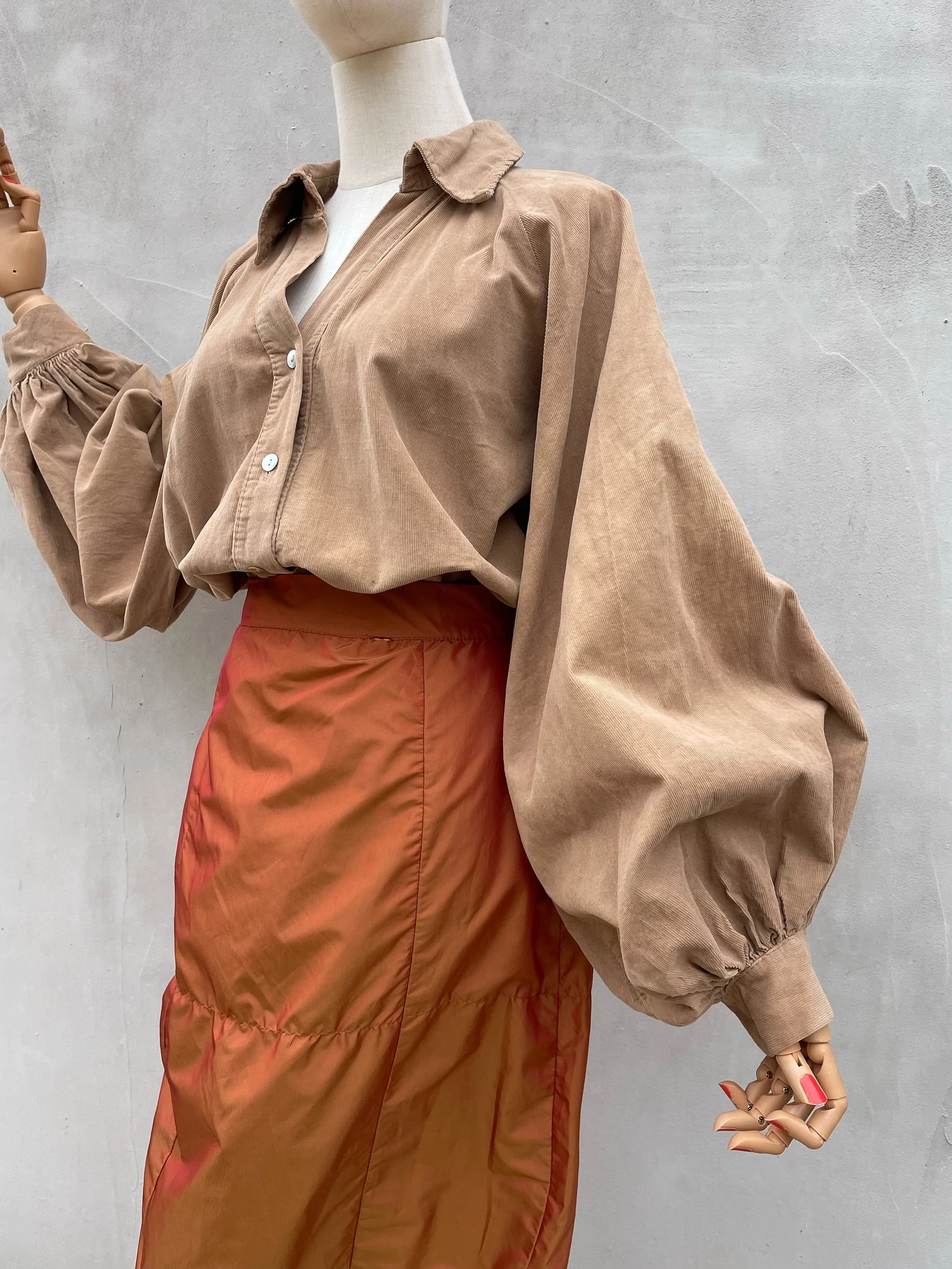 Sötét bézs, vékony kordozású, mutatatós ballon ujjú ing, Made in Italy. One size, M méretre, oversize viseltben S-re is ajánlom.
