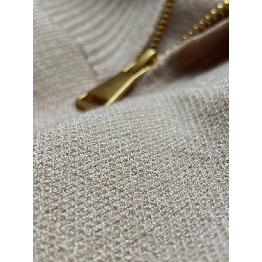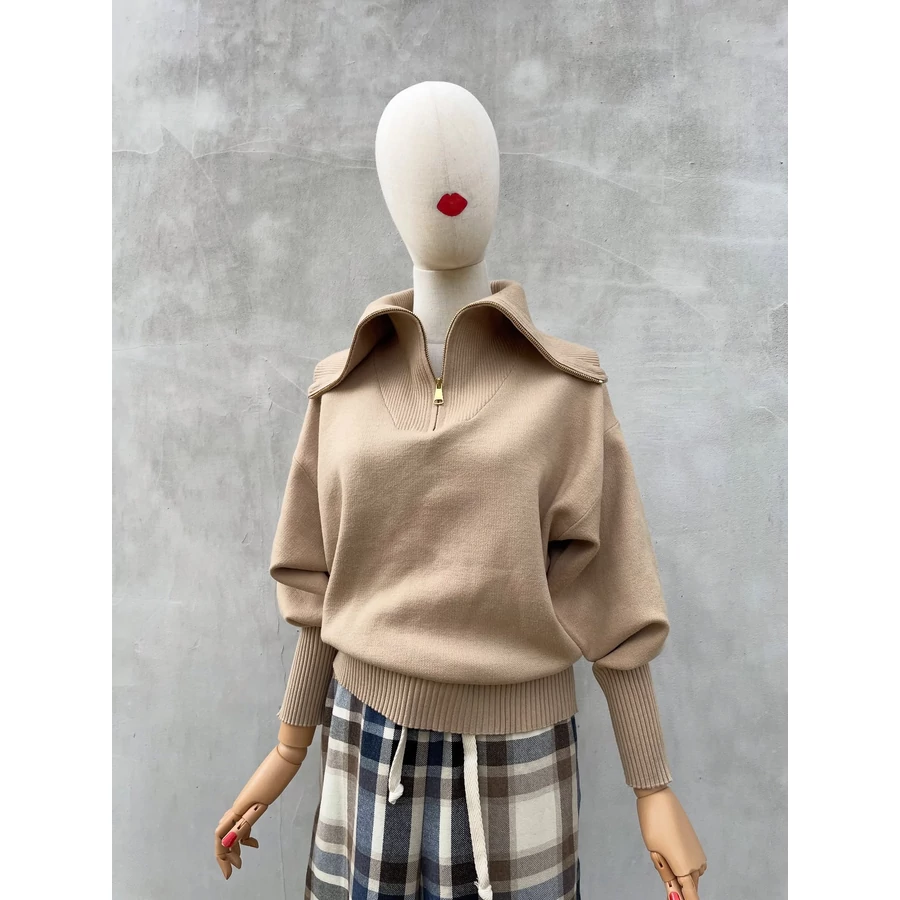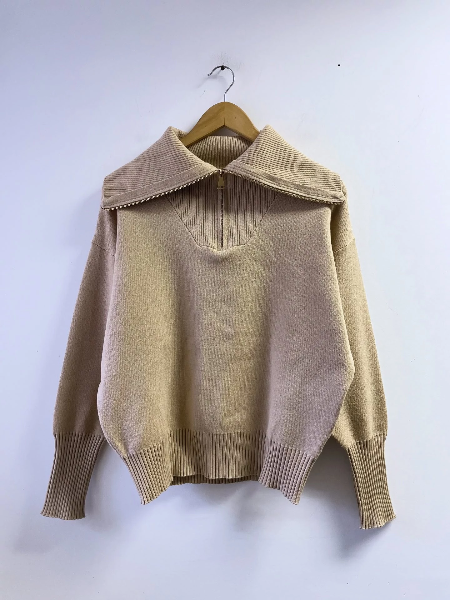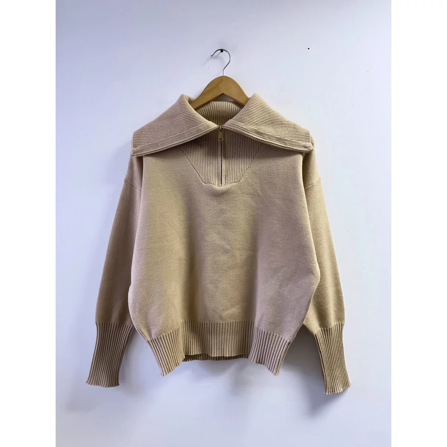 Karemell barna Lascana pulóver, széles gallérral, arany színű cipzárral. Hangsúlyos, ballon ujj. Szép darab, viszkóz keverék anyagból. L-es