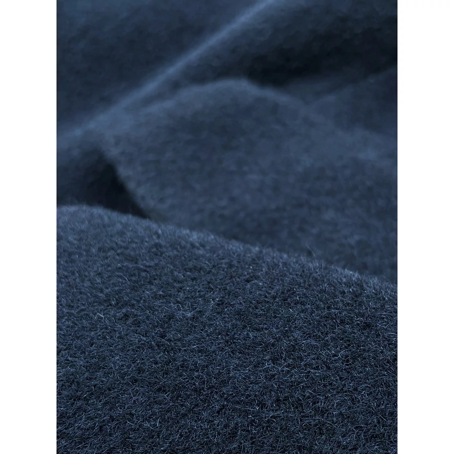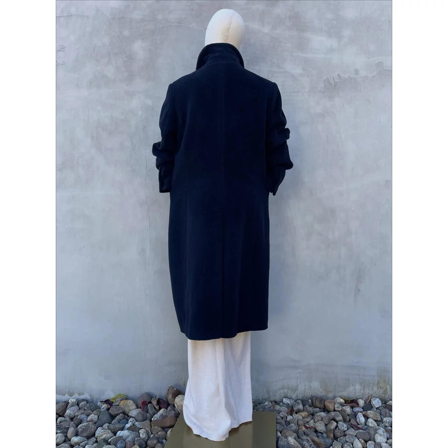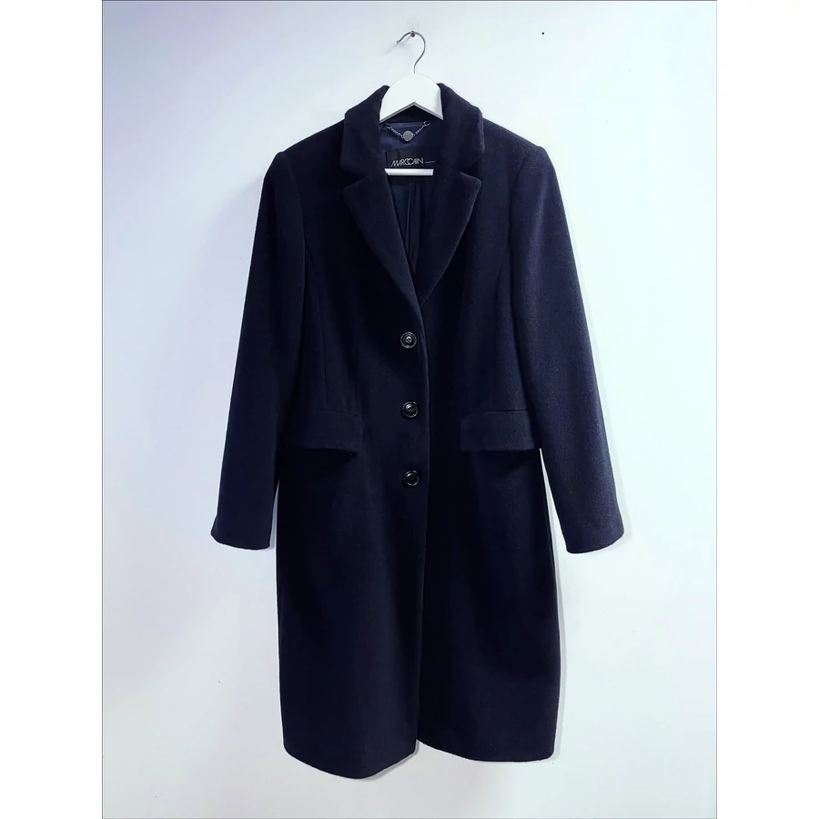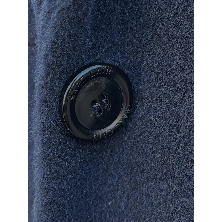 Sötétkék Marc Cain szövetkabát, egysoros gombolással. Összetétele: 52% alpaca, 26% gyapjú, 22% poliamid. Bélése viszkóz keverék. Pompás darab, kívül belül hibátlan. Szerintem nem is viselte senki. N3, ami L-es méretnek felel meg. (Jelenleg is kapható, ára 228.000 ft)