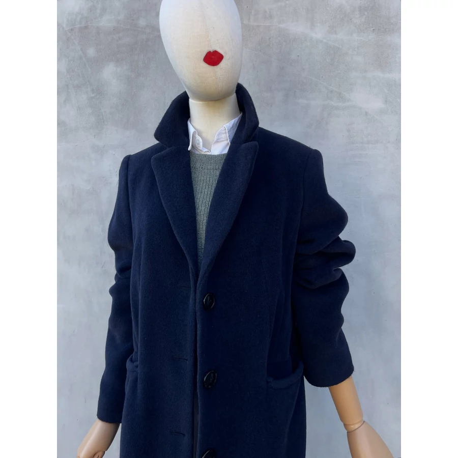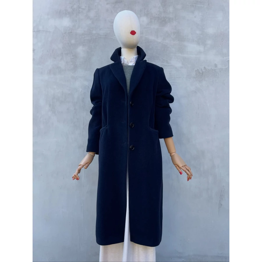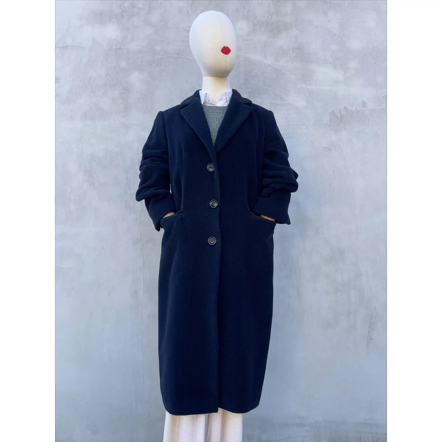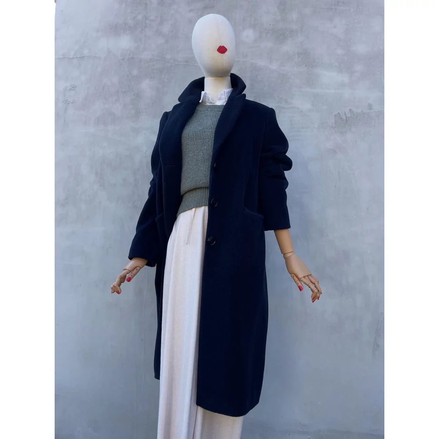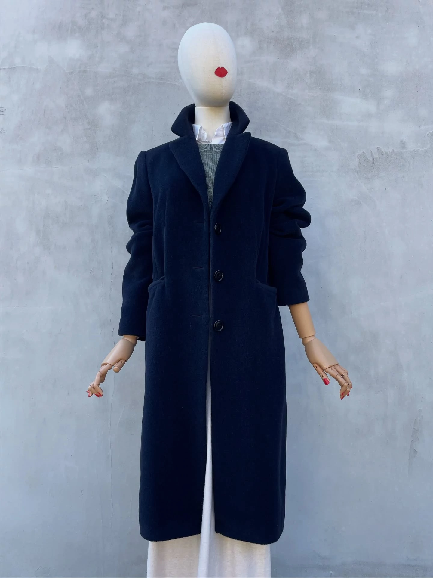 Sötétkék Marc Cain szövetkabát, egysoros gombolással. Összetétele: 52% alpaca, 26% gyapjú, 22% poliamid. Bélése viszkóz keverék. Pompás darab, kívül belül hibátlan. Szerintem nem is viselte senki. N3, ami L-es méretnek felel meg. (Jelenleg is kapható, ára 228.000 ft)