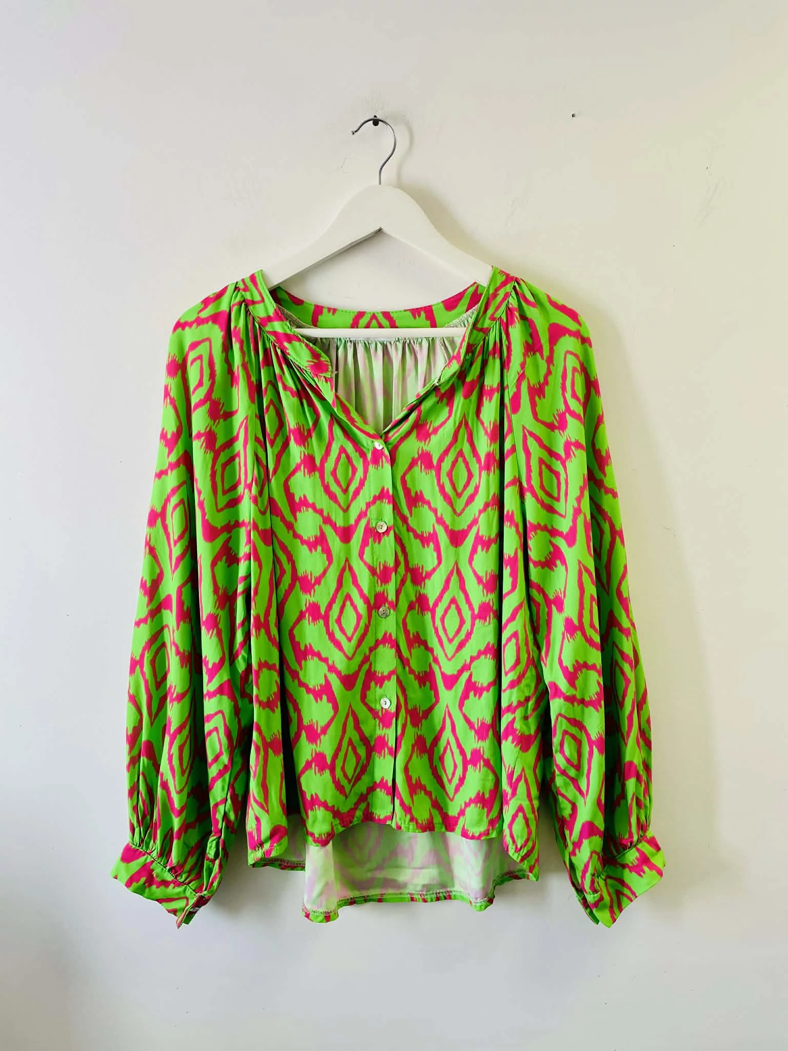 Neonzöld-pink, viszkóz felső Olaszországból ballon ujjal. Méret nélkül, S/M