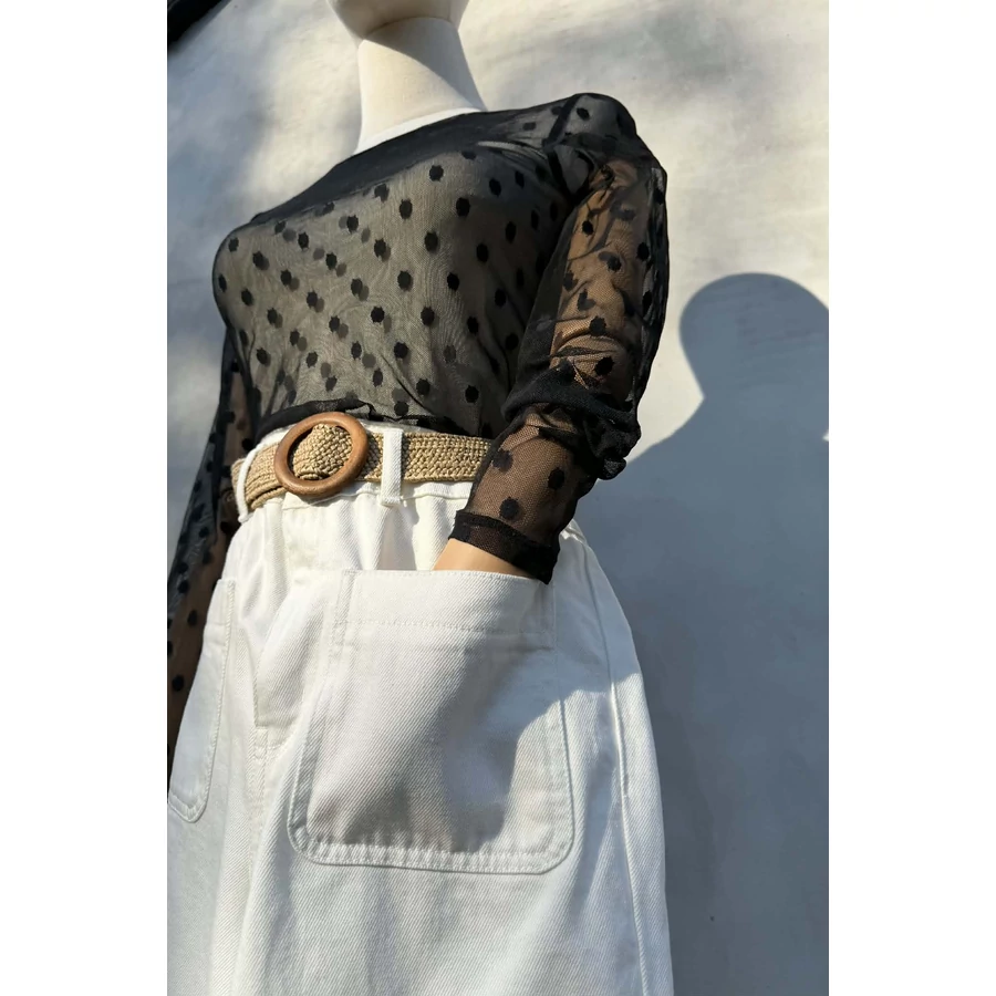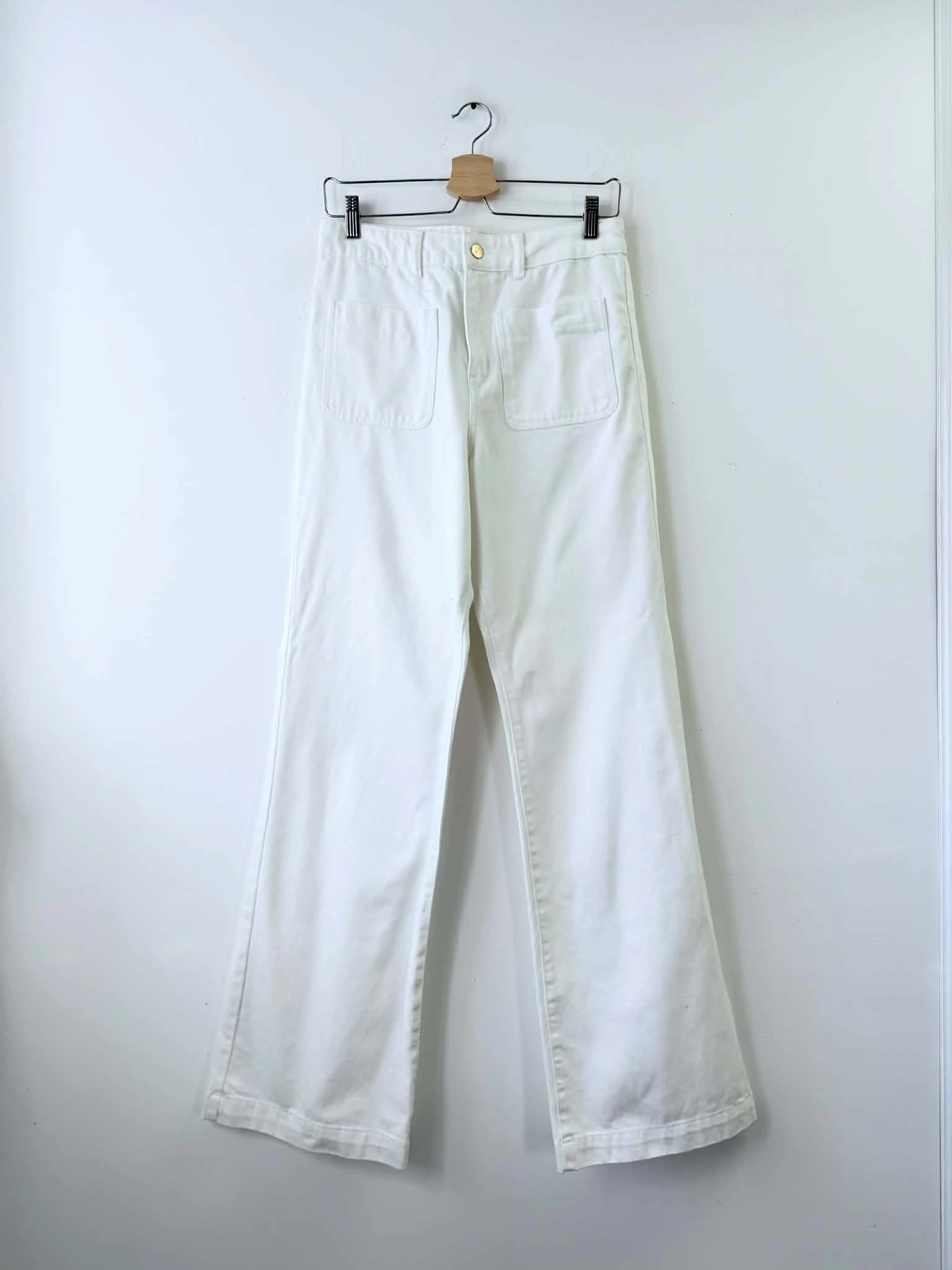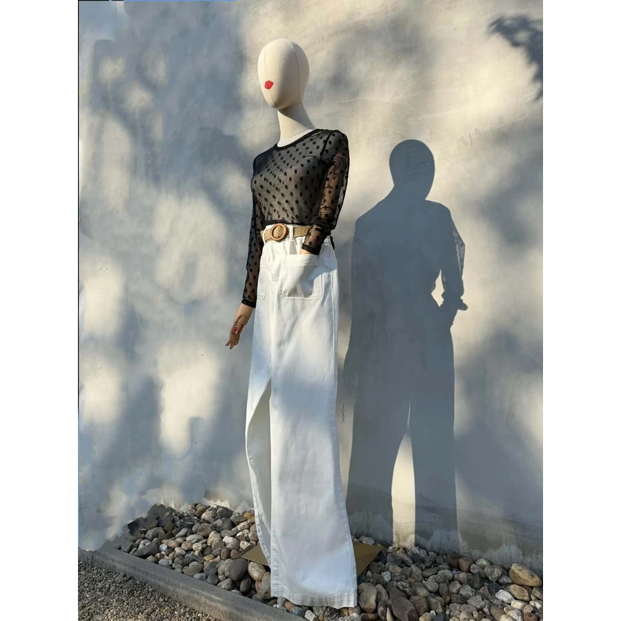 Törtfehér, magas derekú farmernadrág a párizsi brandtől, melynek küldetése, hogy elérhető luxust kínáljon a "Zara és a Prada között" - vallja az alapító Sybille Roger-Vasselin.