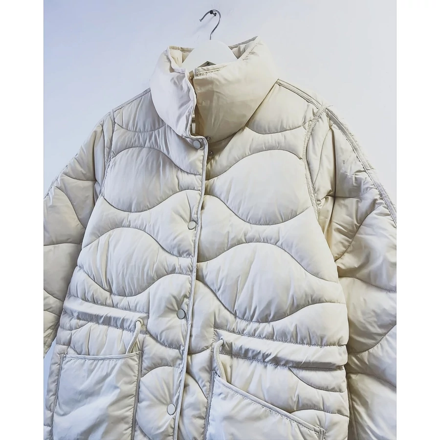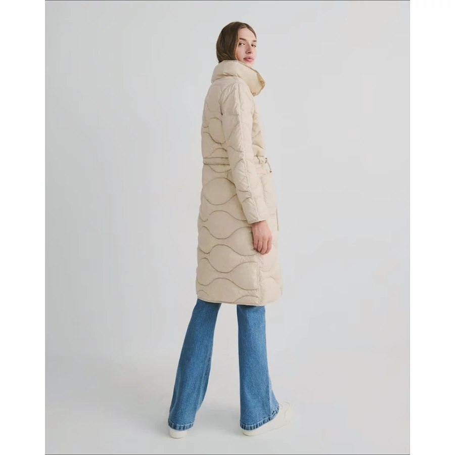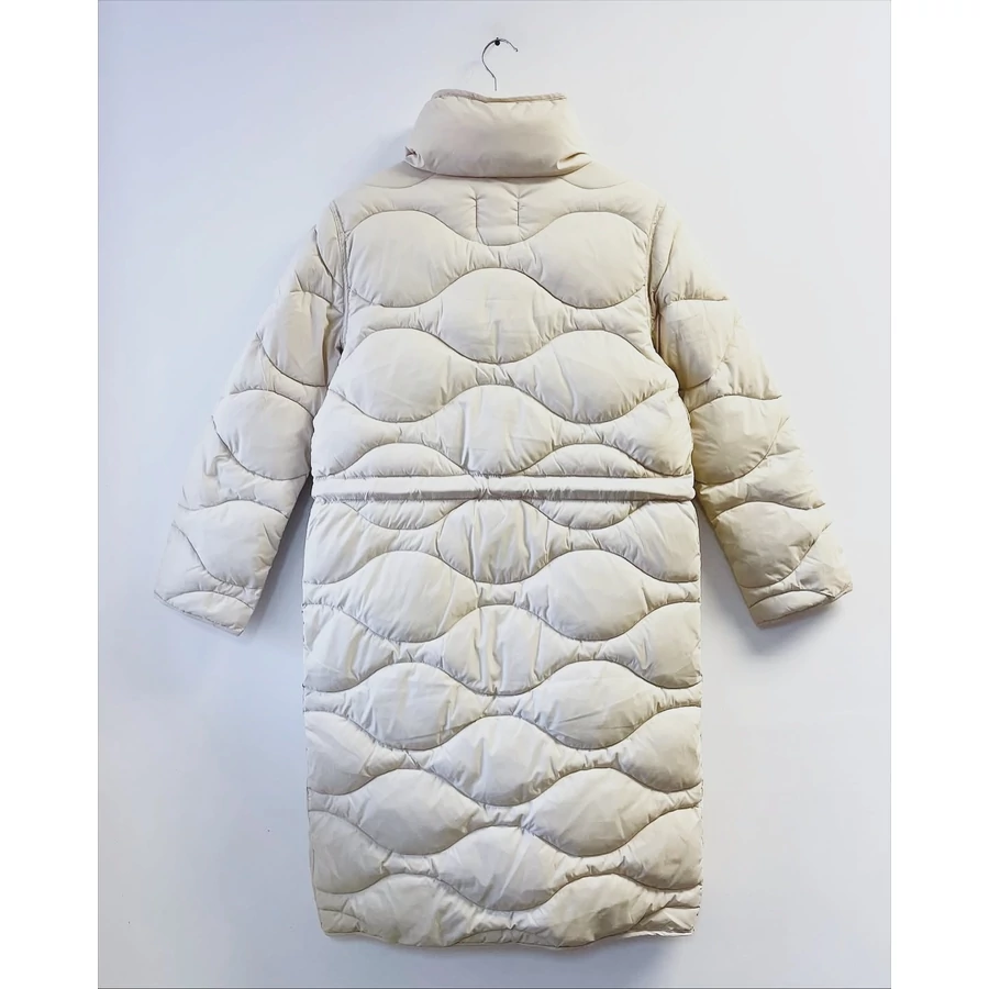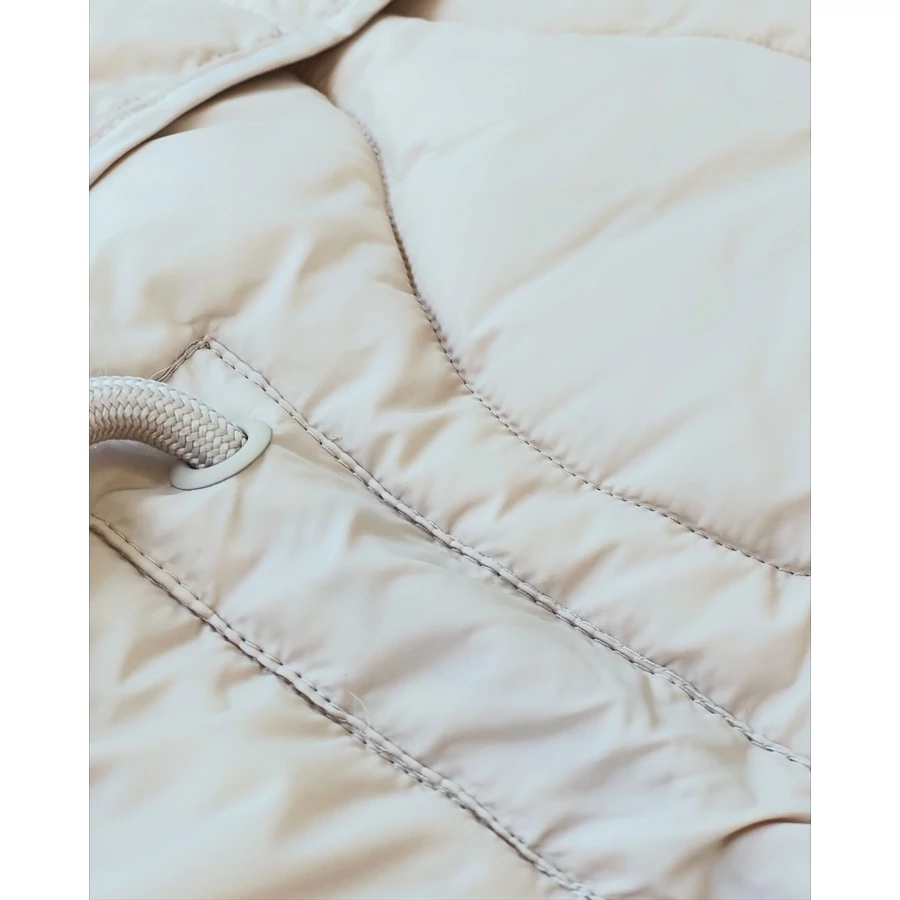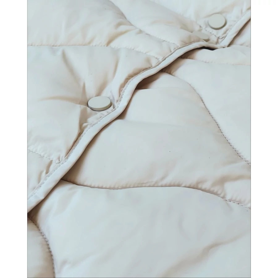 Halvány bézs (nude) steppelt kabát. Közepesen vastag töltettel, enyhe teleken télikabátként is viselhető. Patentokkal záródik. Új, sosem viselt. S-es