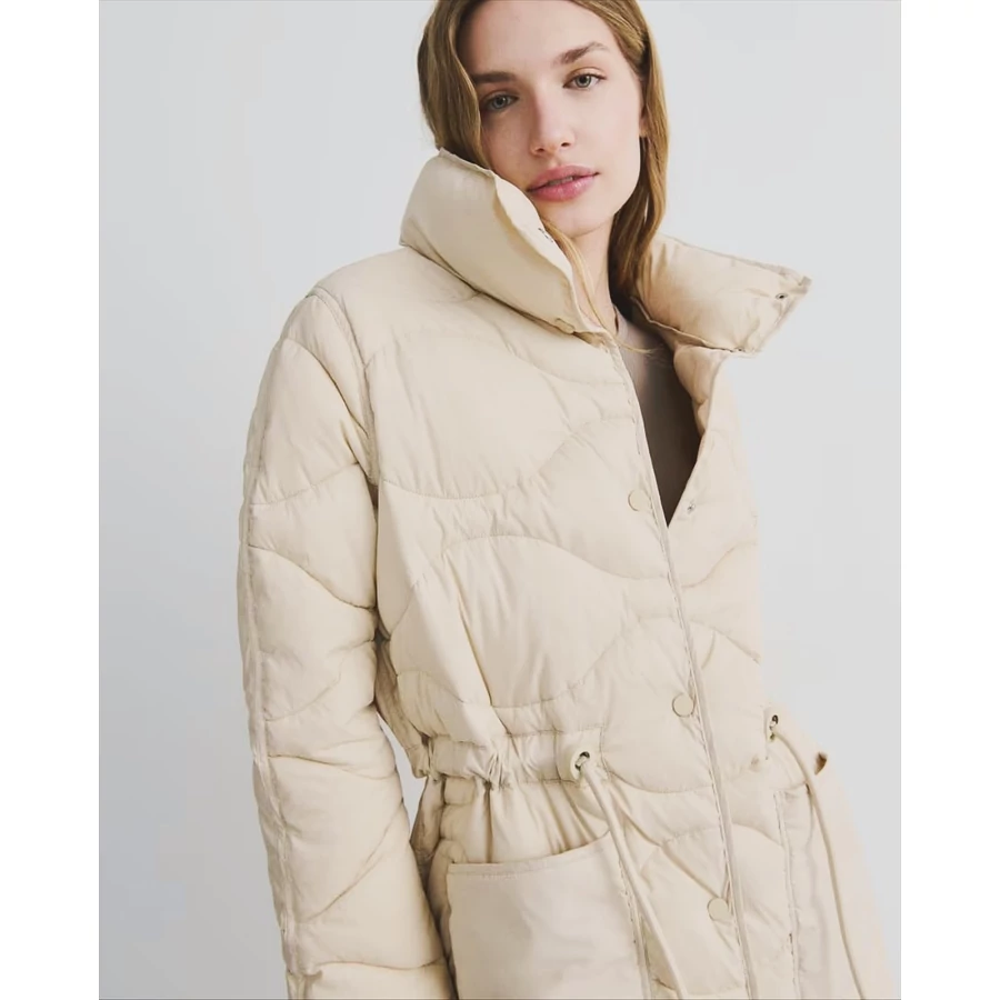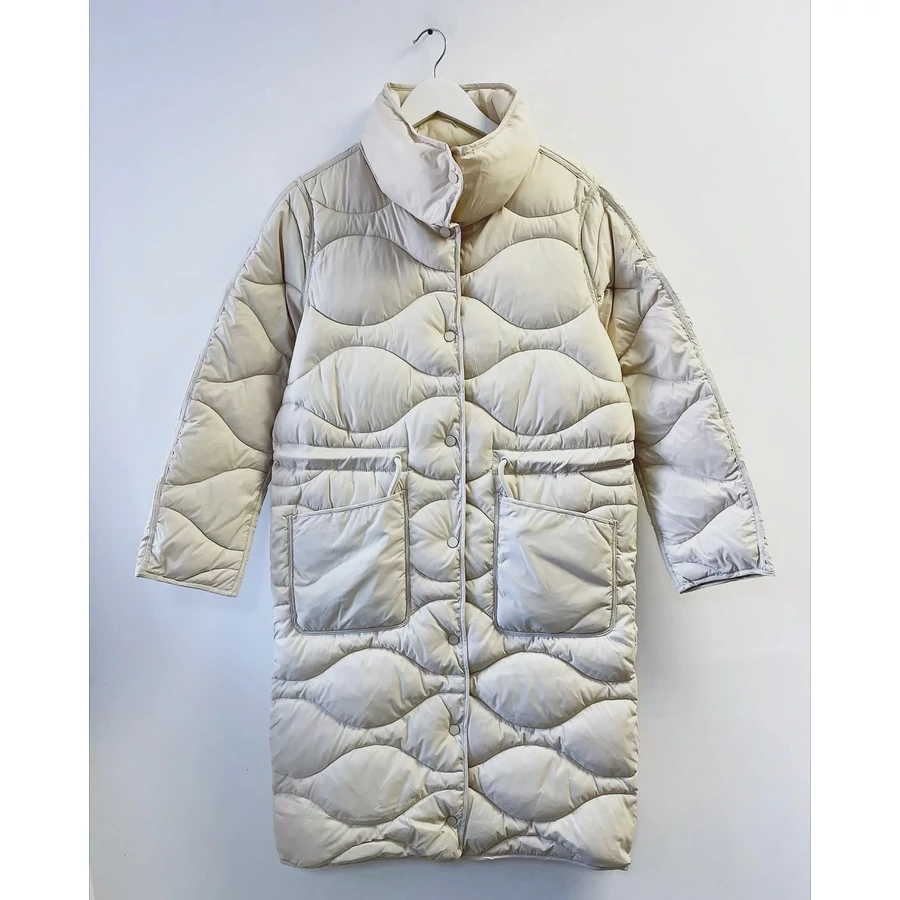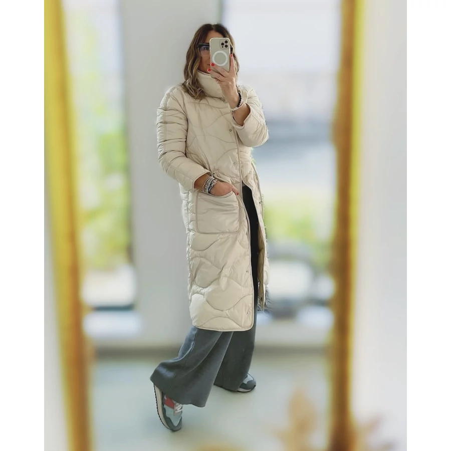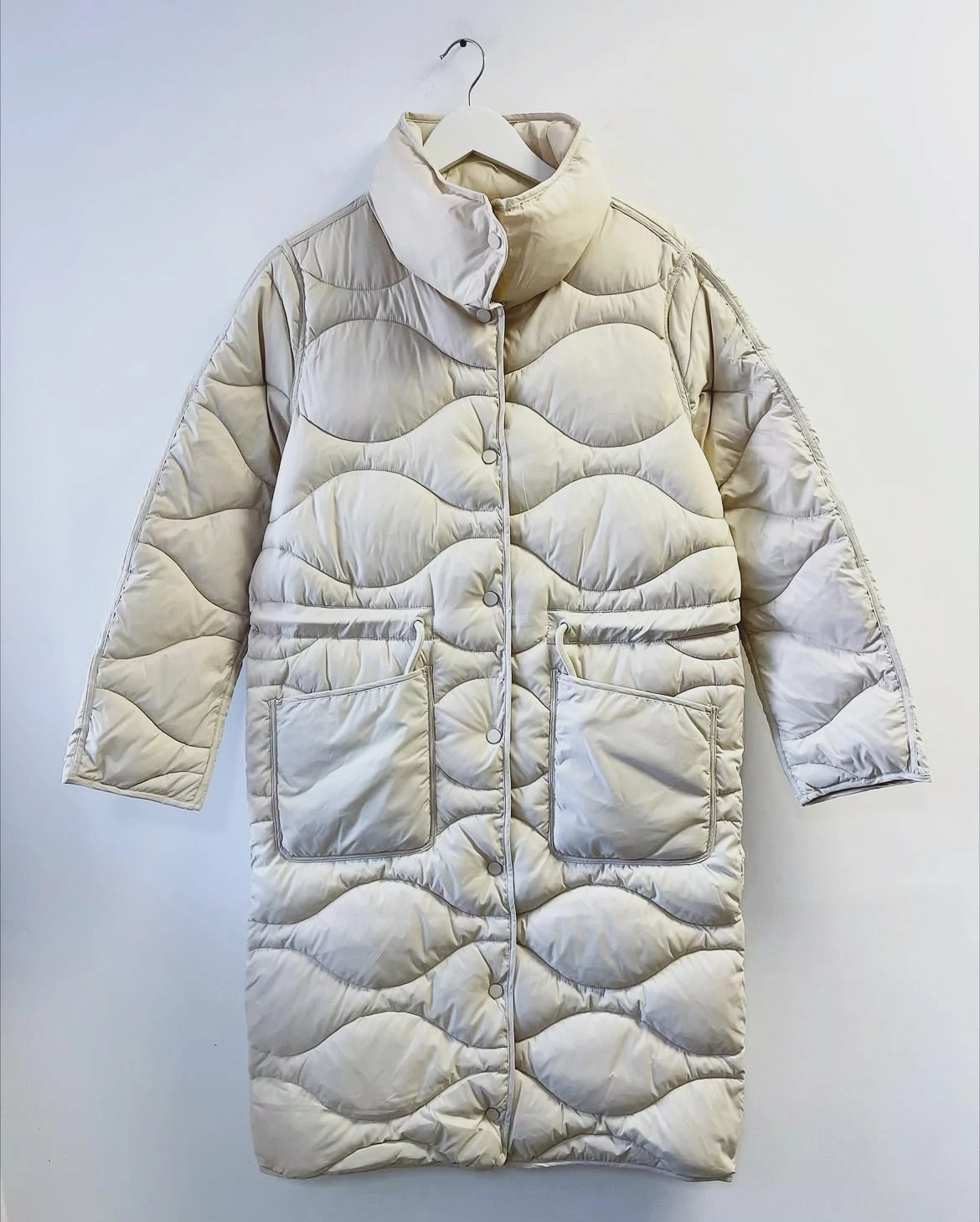 Halvány bézs (nude) steppelt kabát. Közepesen vastag töltettel, enyhe teleken télikabátként is viselhető. Patentokkal záródik. Új, sosem viselt. S-es