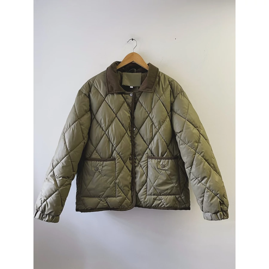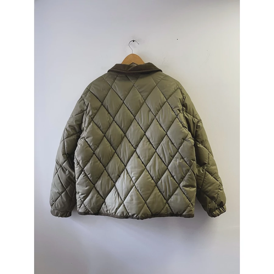 Kekizöld, steppelt dzseki, kord szegélyekkel, rátett zsebekkel. Patentokkal záródik. Közepesen vastag, béléses. Beleírt L, de oversize M-re is ajánlom. A használat semmilyen nyoma nem látszik rajta, újnak mondható.
