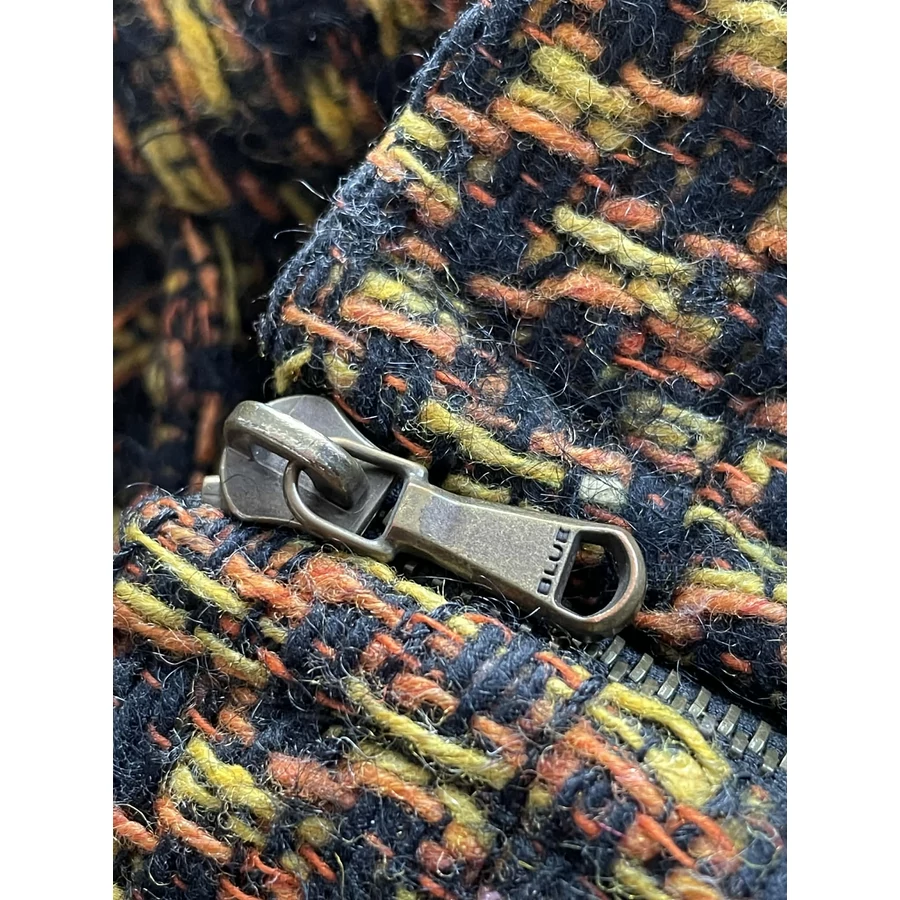 Gyapjú-mohair keverék, karcsúsított Strenesse kabátka, cipzáros és patentokkal is záródik. Magasított gallérja csatokkal rögzíthető. Narancs-sárga-fekete szövött anyag, fekete bélés. Logós patentok, cipzárhúzók. Szép, nőis darab. Mérethelyes XS