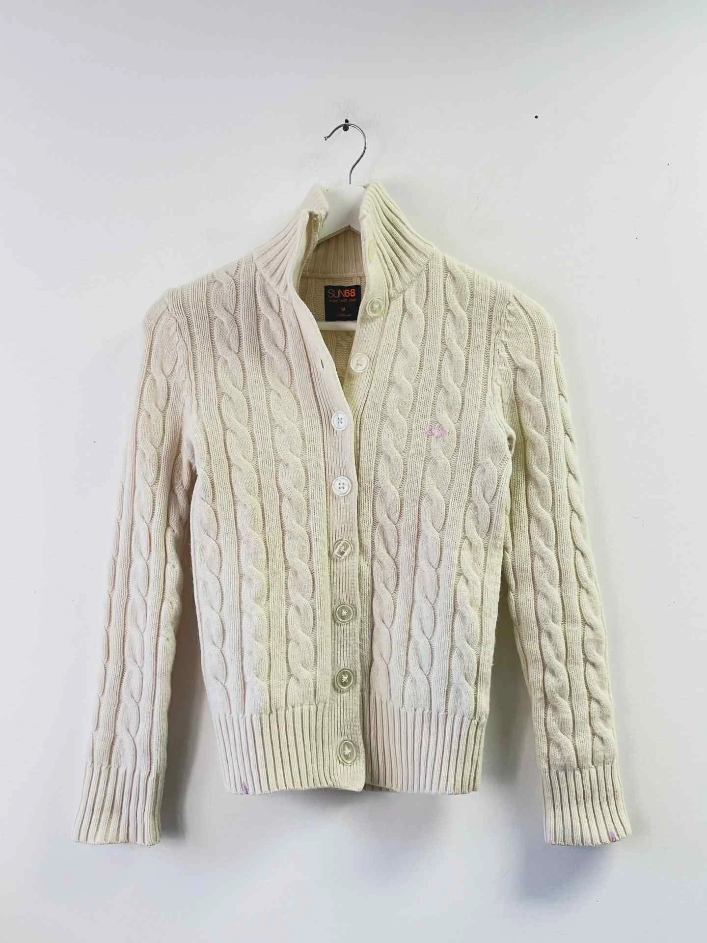Halvány bézs, csavartmintás, 100 gyapjú kardigán. Nagyon szép darab! S-es