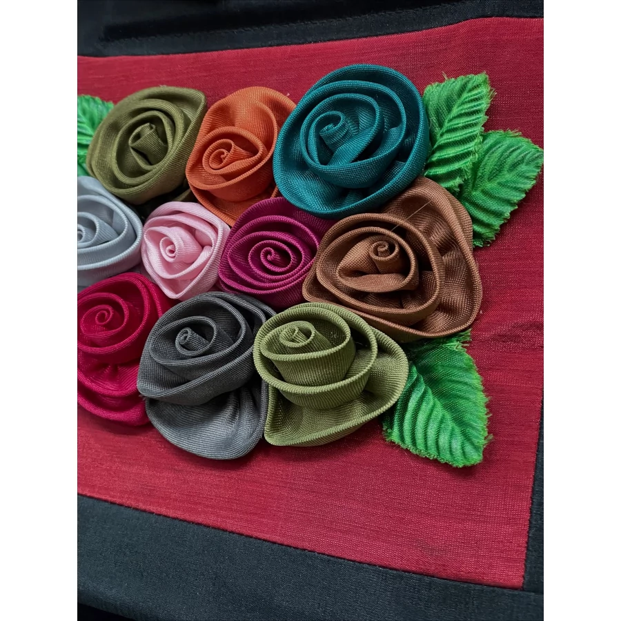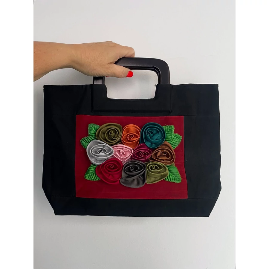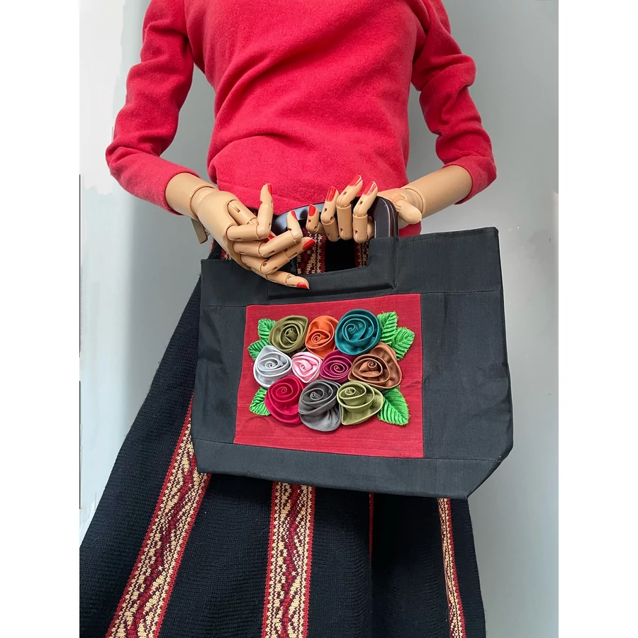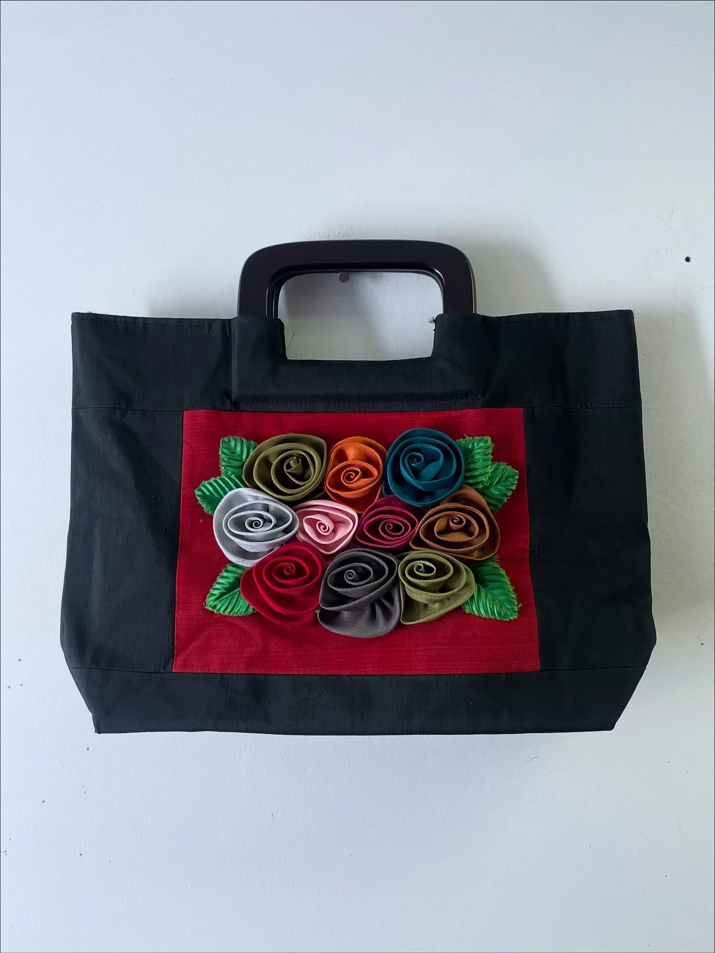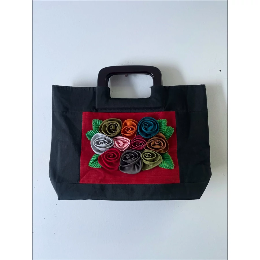 Handmade táska, fekete fa füllel, valódi selyemből. Rádolgozott, színes selyemrózsák díszítik. Egyterű, két belső zsebbel. Mágnespatenttal záródik. 23x34 cm