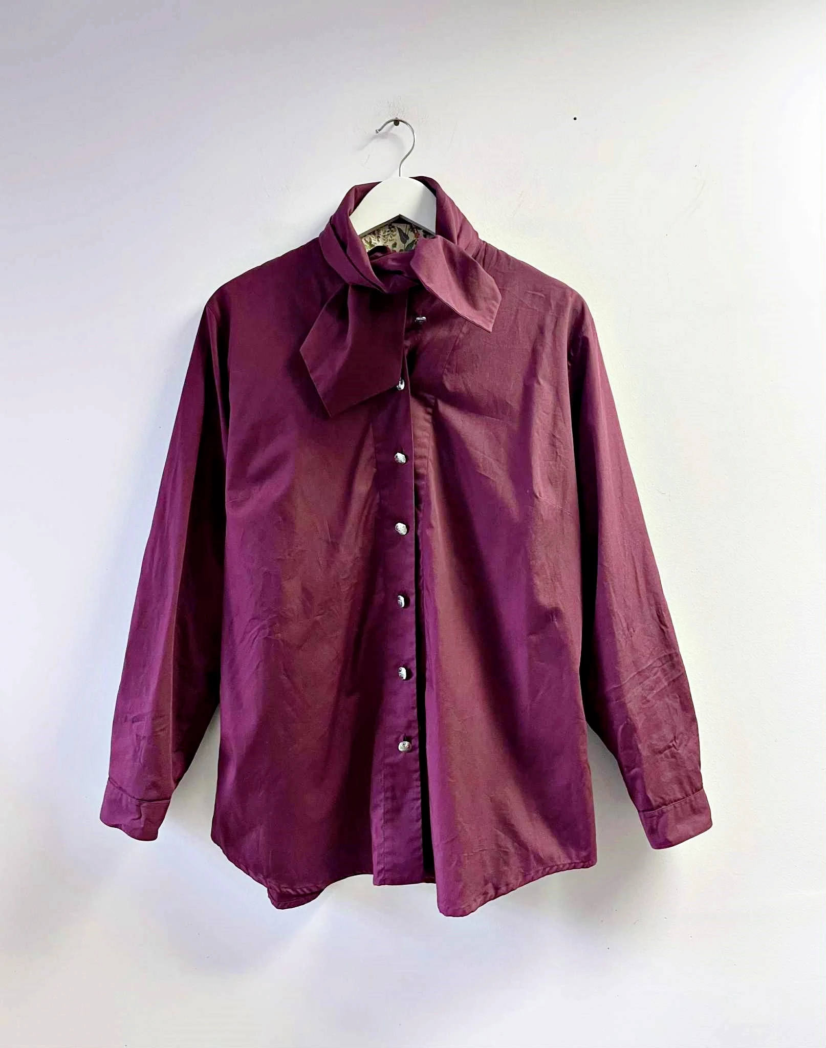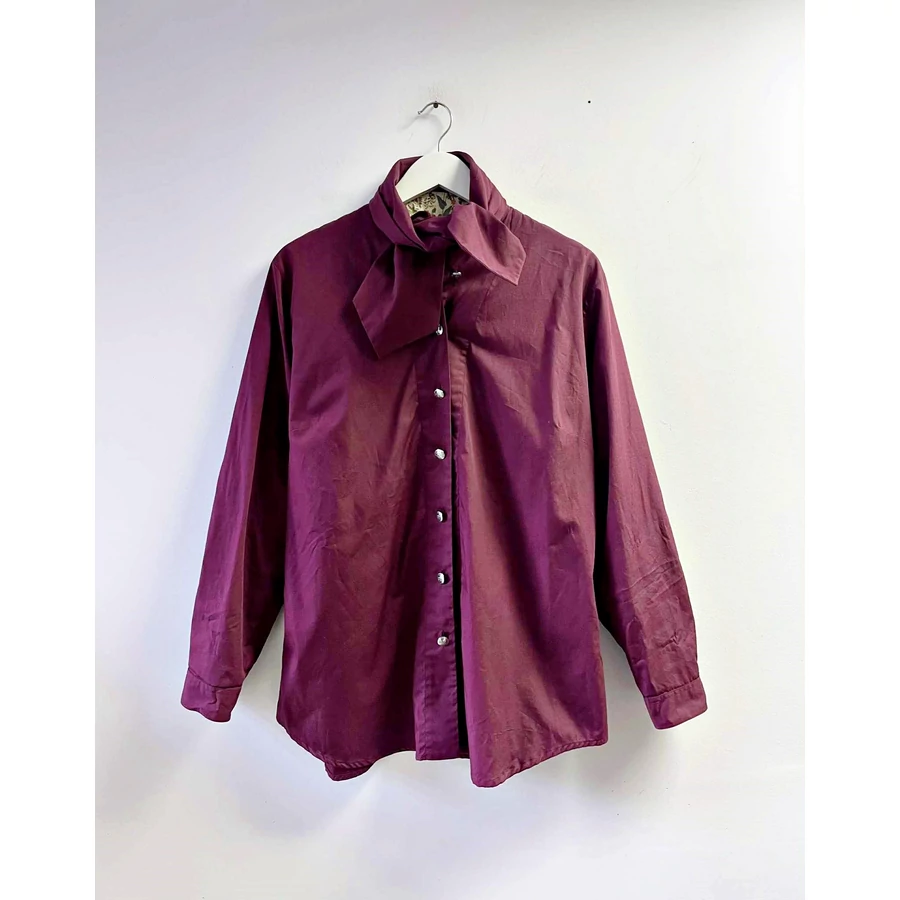 Bordó vászon ing, ezüst színű gombokkal, széles sálgallérral amit elöl csomóra köthetsz. A kezelők és a gallér belseje színes virágmintás. Különleges darab, mérethelyes 44-es.